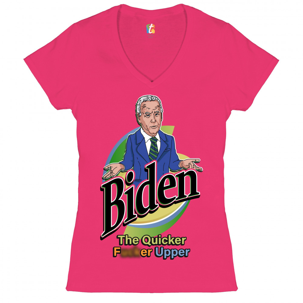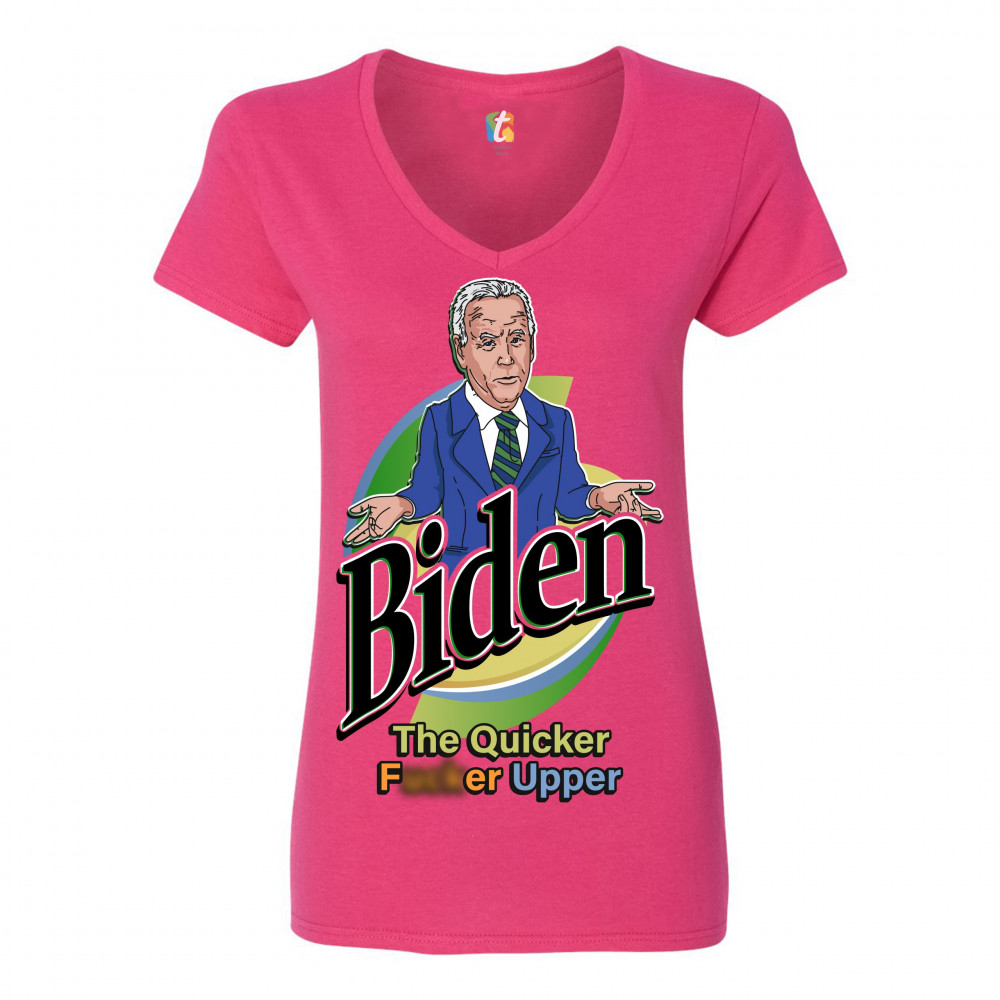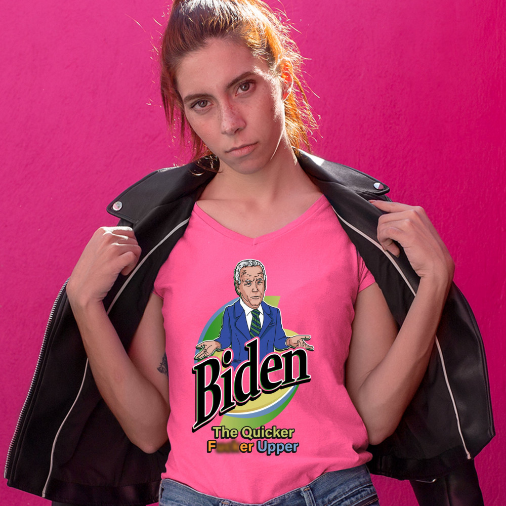 A funny political print featuring a confused Joe Biden shrugging his shoulders and spreading his arms. The print says "Biden the Quicker F*cker Upper". A great choice to wear for a Trump rally or give as a gift to a Donald Trump supporter before 2024 pres