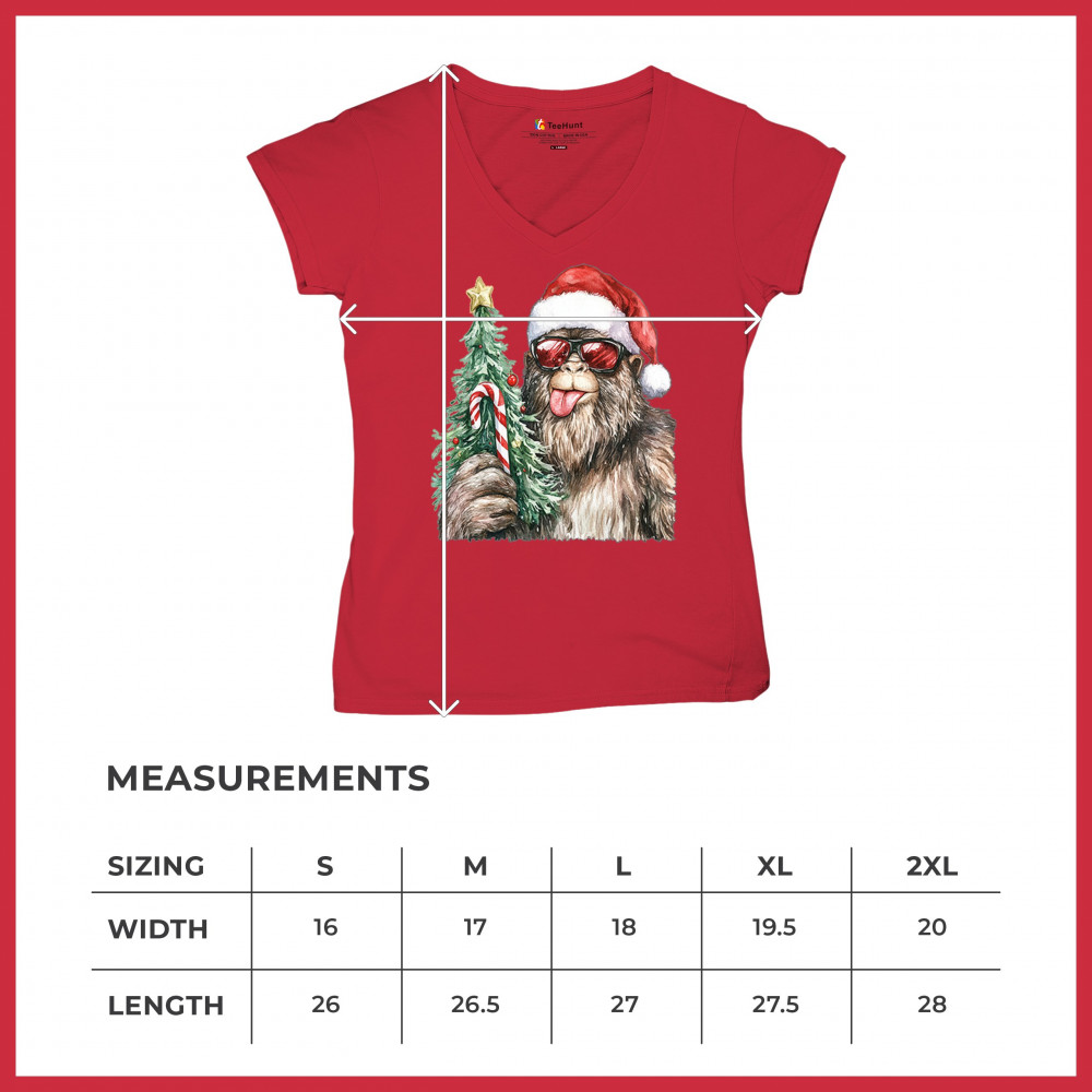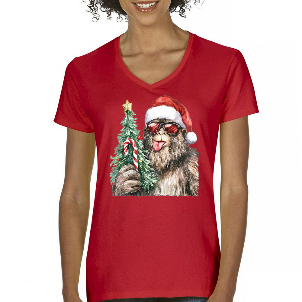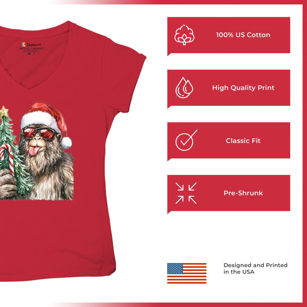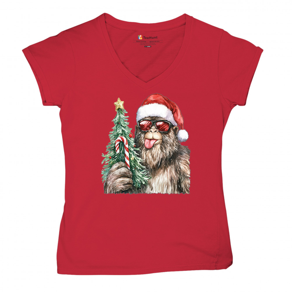 Bigfoot Christmas Santa shirt – festive Sasquatch holiday humor tee with Santa hat design, Xmas tree, candy cane, and funny Christmas style.