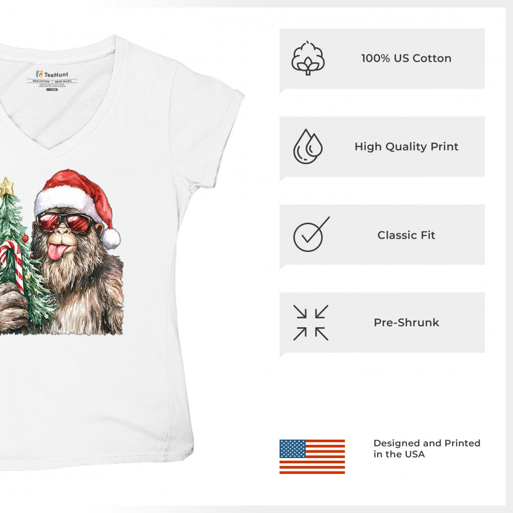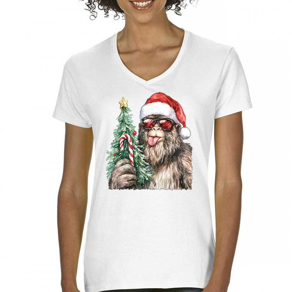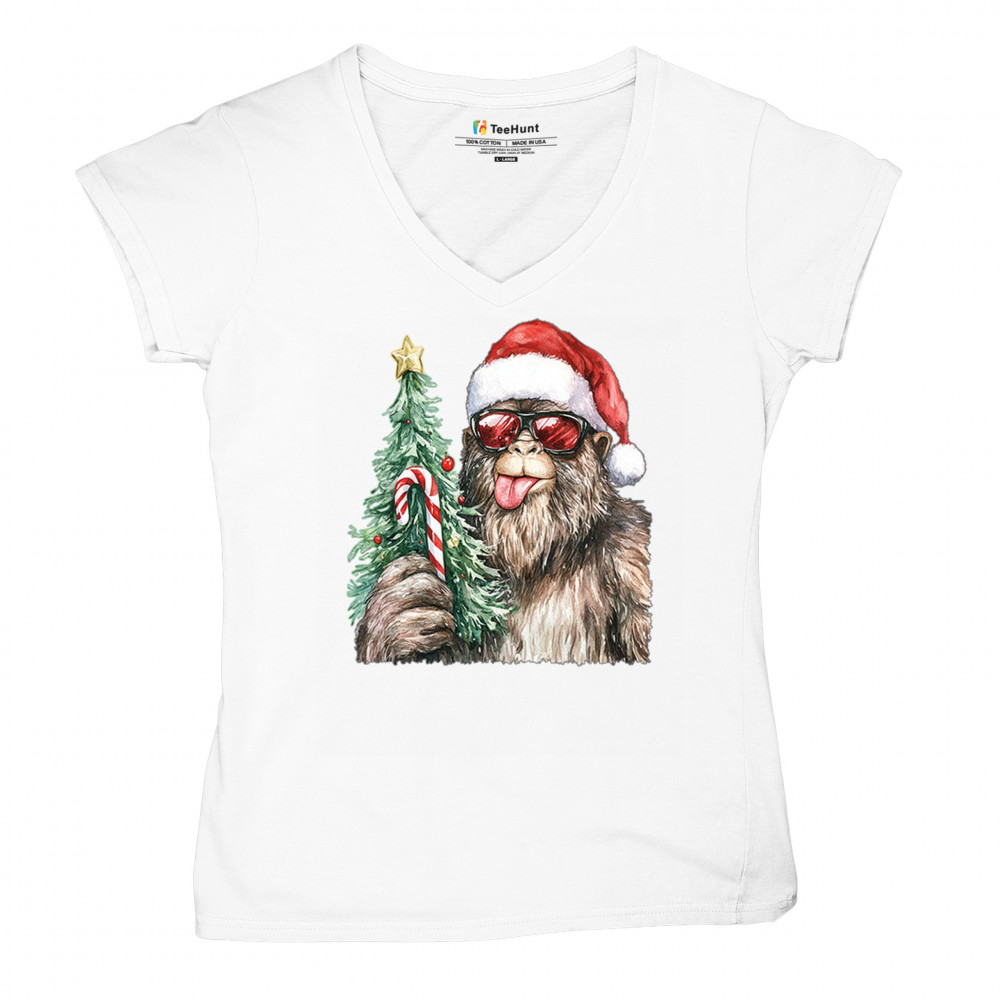 Bigfoot Christmas Santa shirt – festive Sasquatch holiday humor tee with Santa hat design, Xmas tree, candy cane, and funny Christmas style.