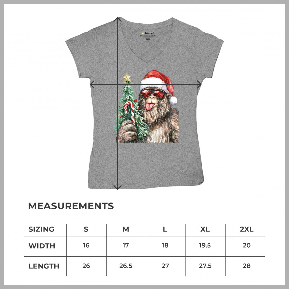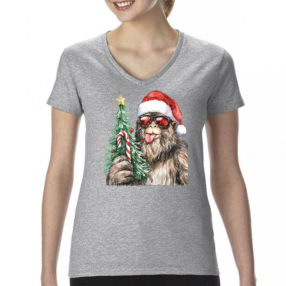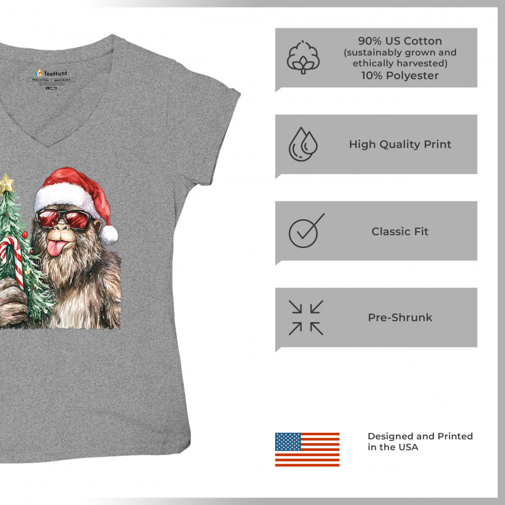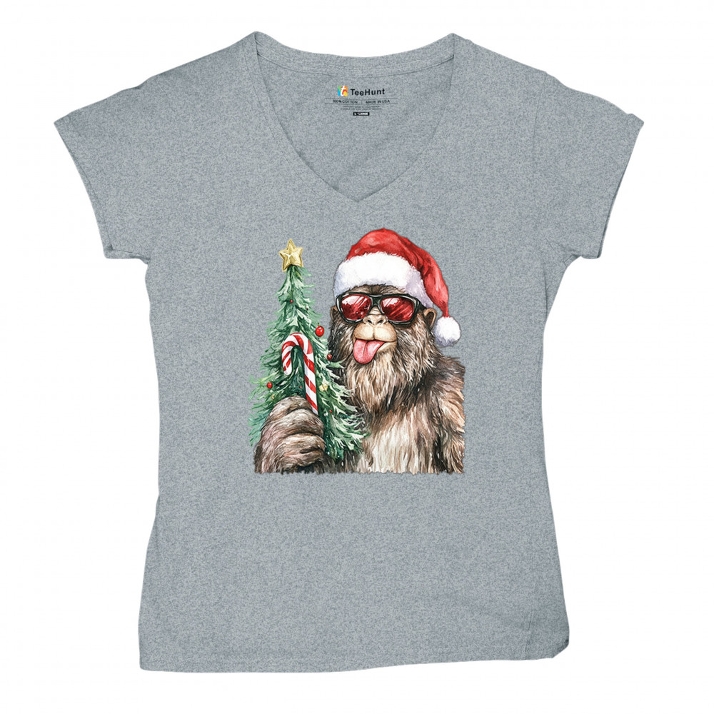Bigfoot Christmas Santa shirt – festive Sasquatch holiday humor tee with Santa hat design, Xmas tree, candy cane, and funny Christmas style.