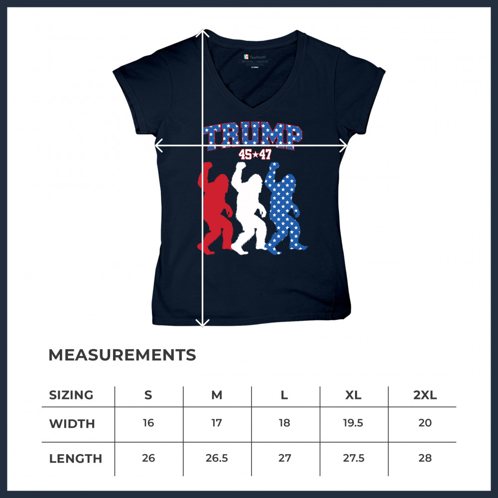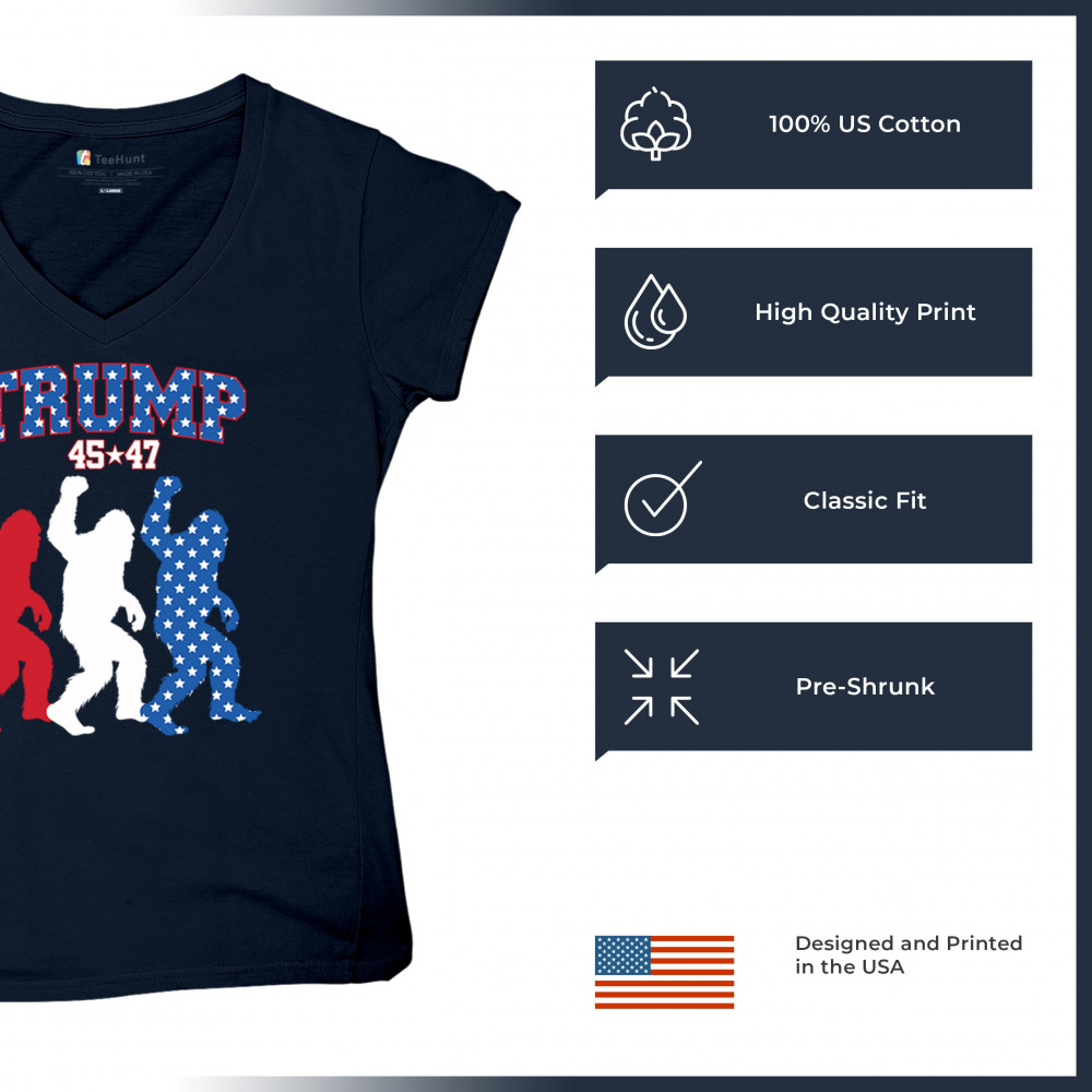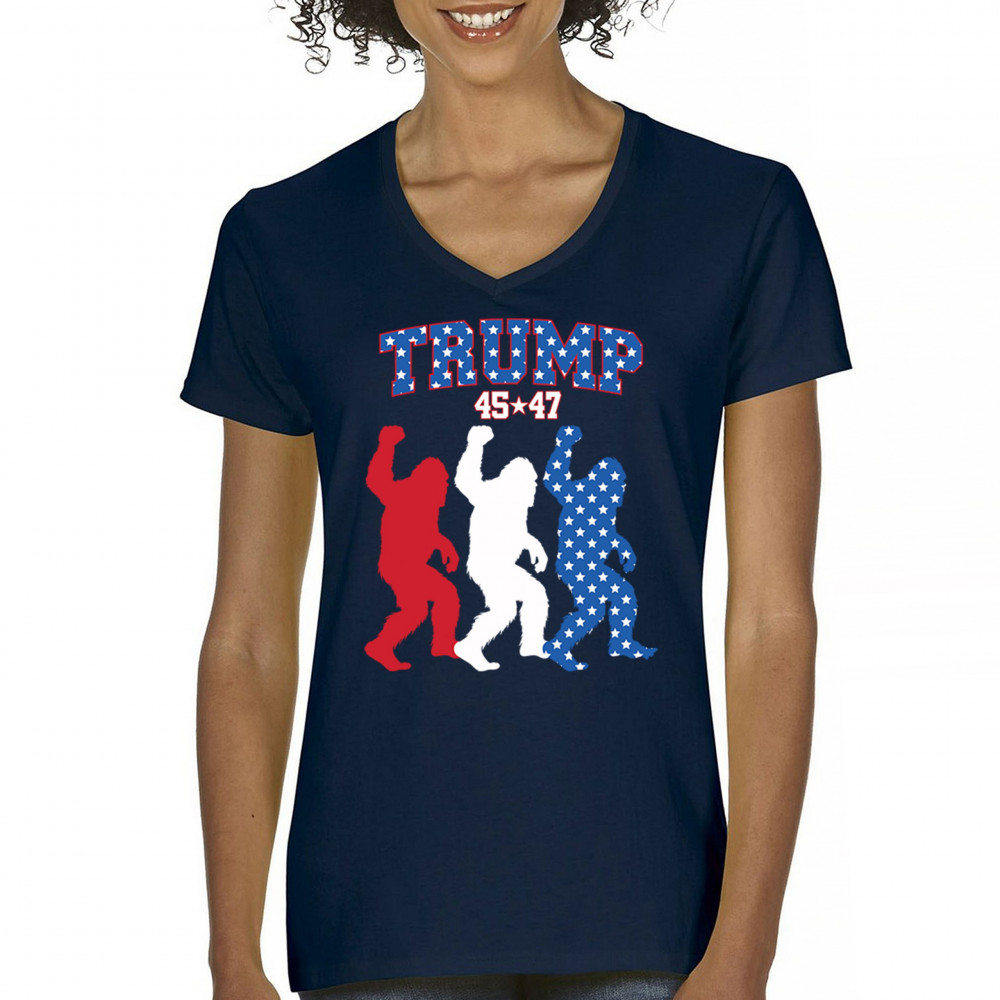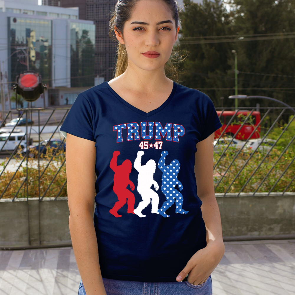 Trump 45/47 Bigfoot design in red, white, and blue with American flag stars. Celebrate patriotism, humor, and the fight for America First values.