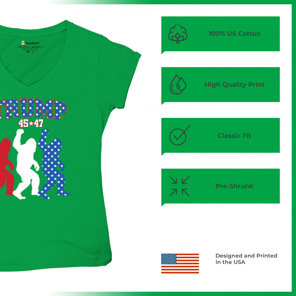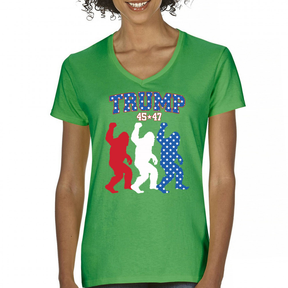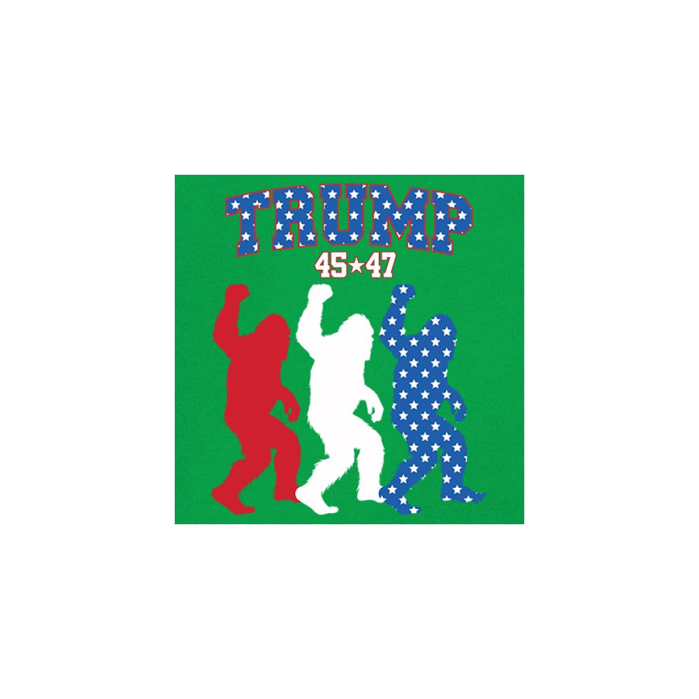 Trump 45/47 Bigfoot design in red, white, and blue with American flag stars. Celebrate patriotism, humor, and the fight for America First values.