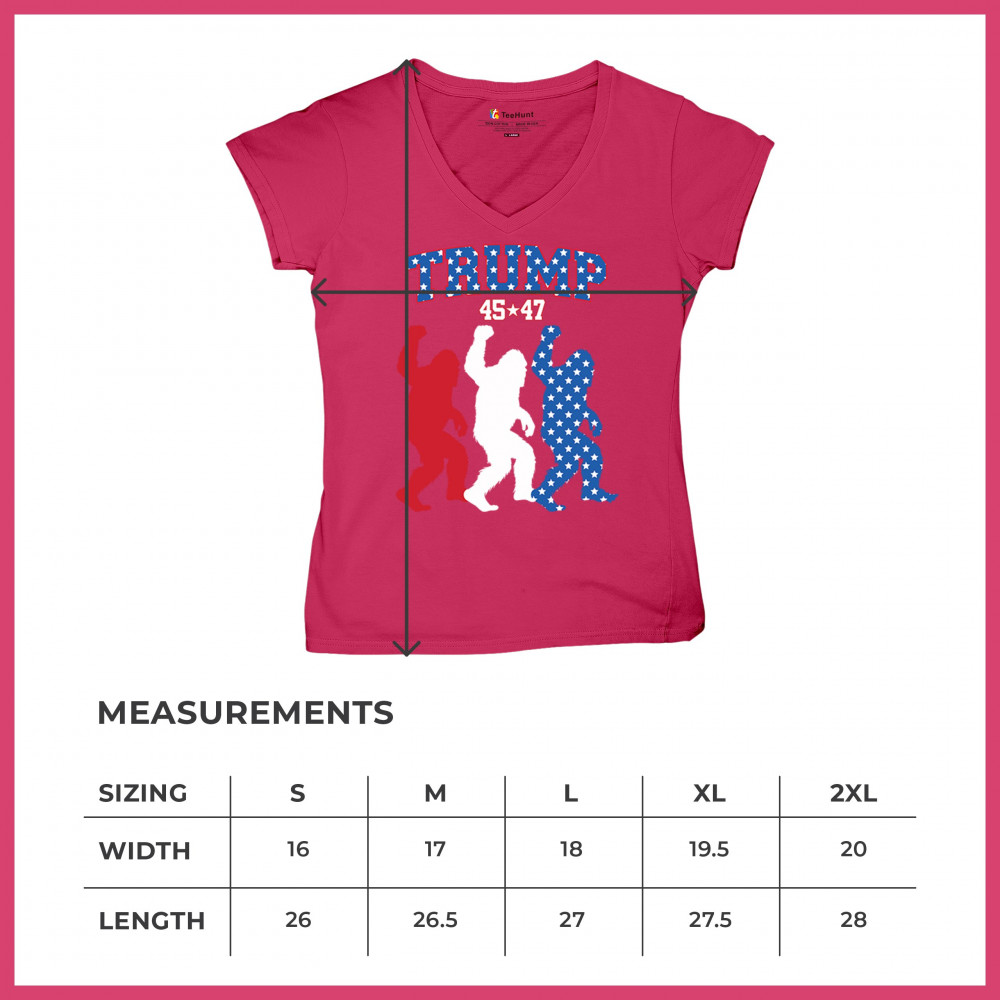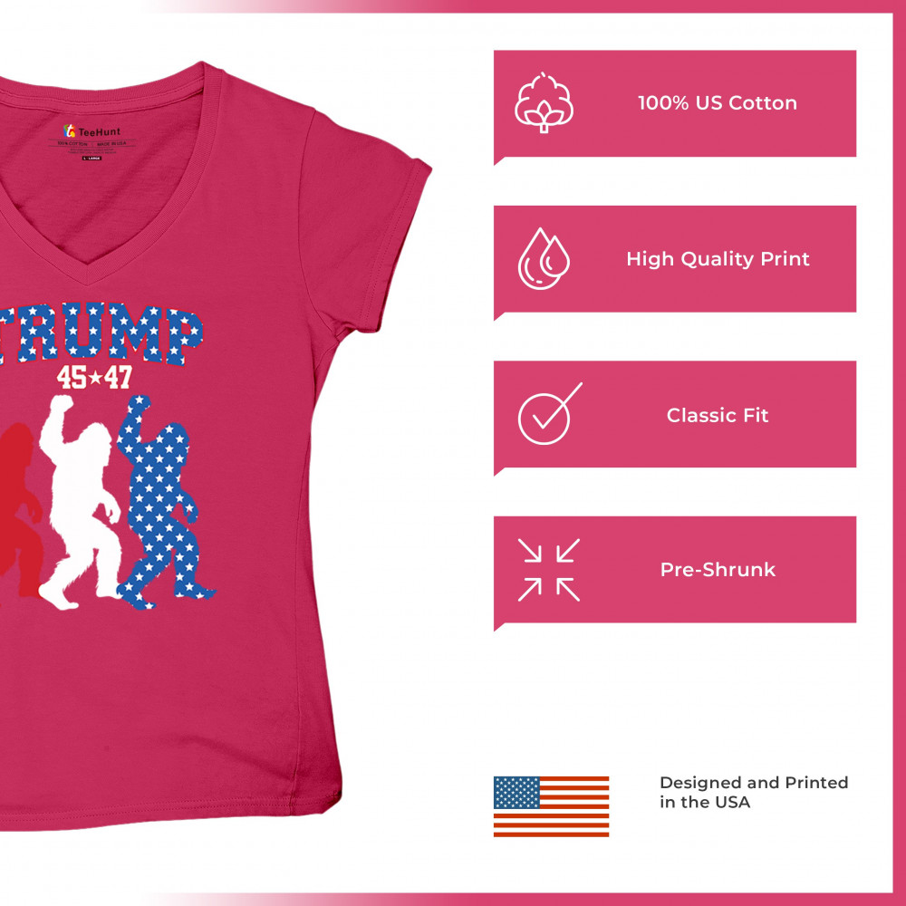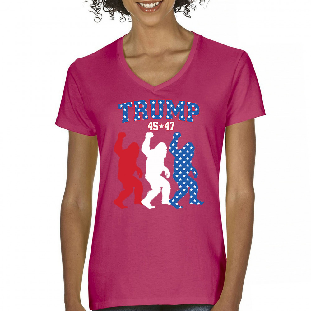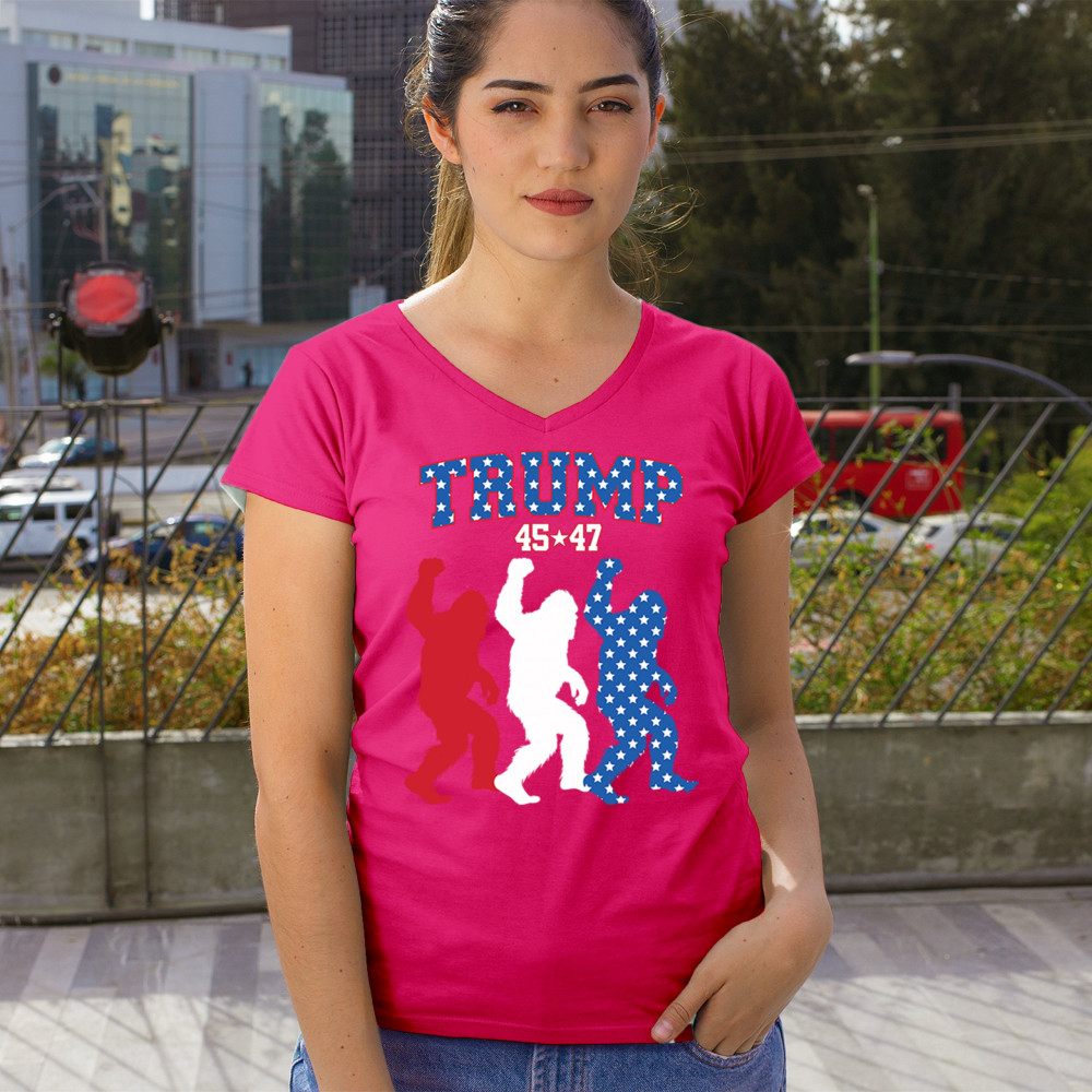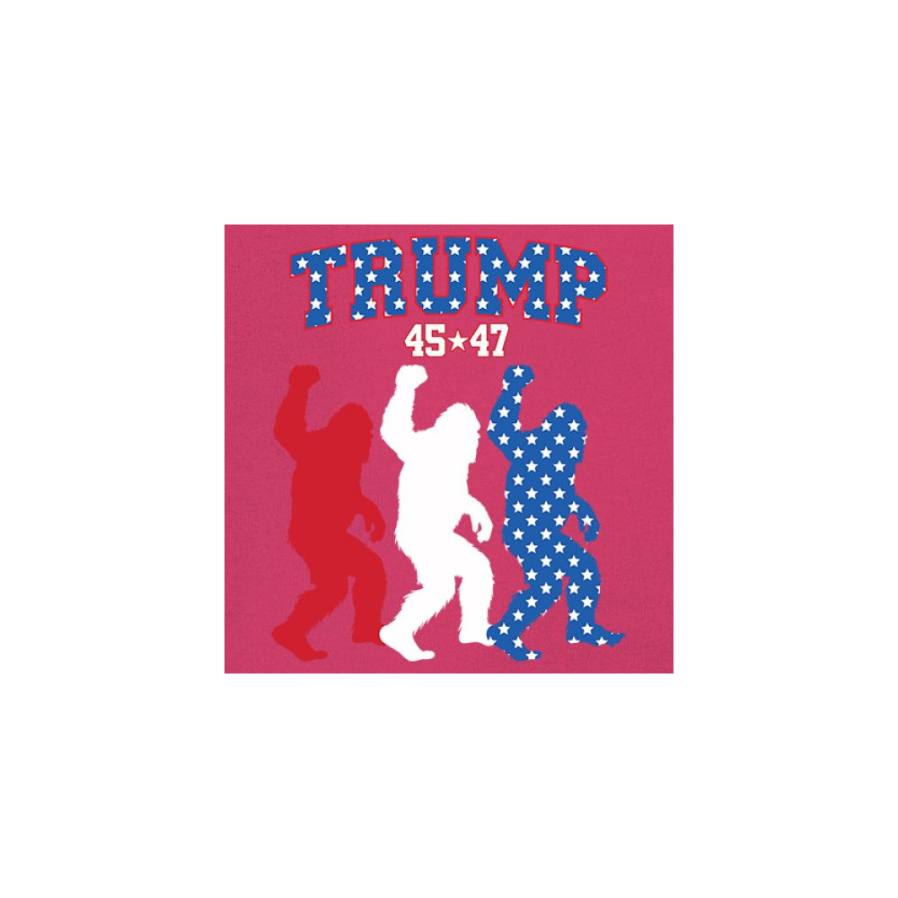 Trump 45/47 Bigfoot design in red, white, and blue with American flag stars. Celebrate patriotism, humor, and the fight for America First values.