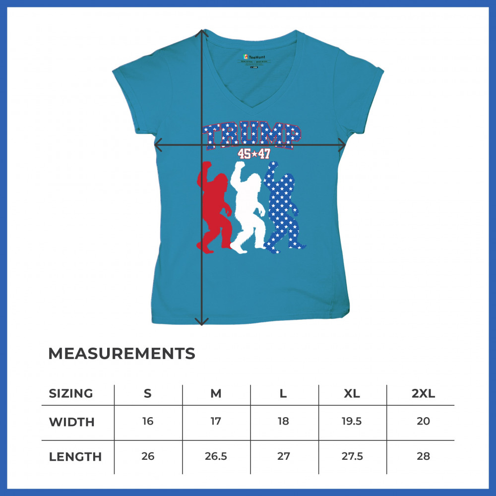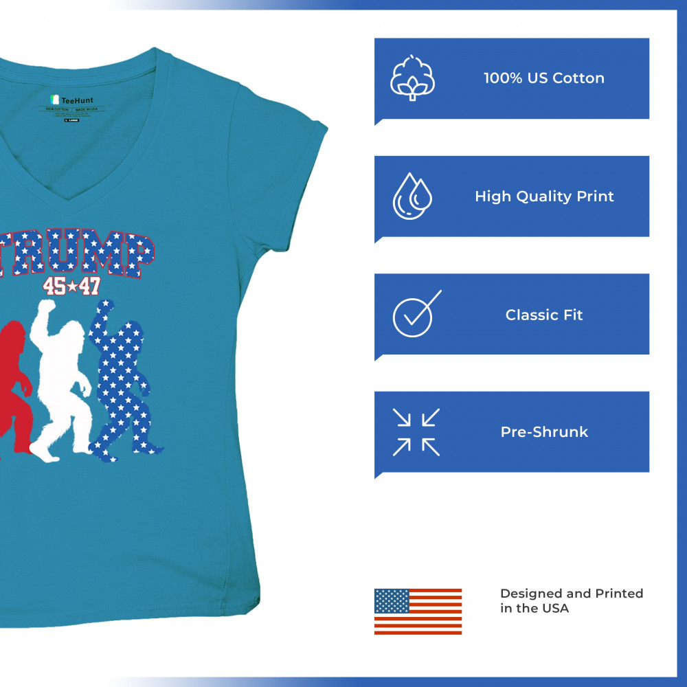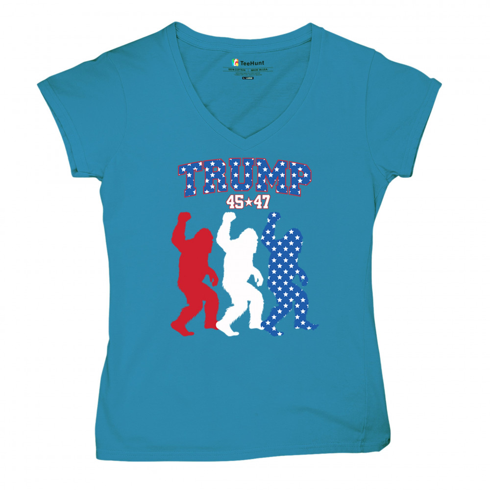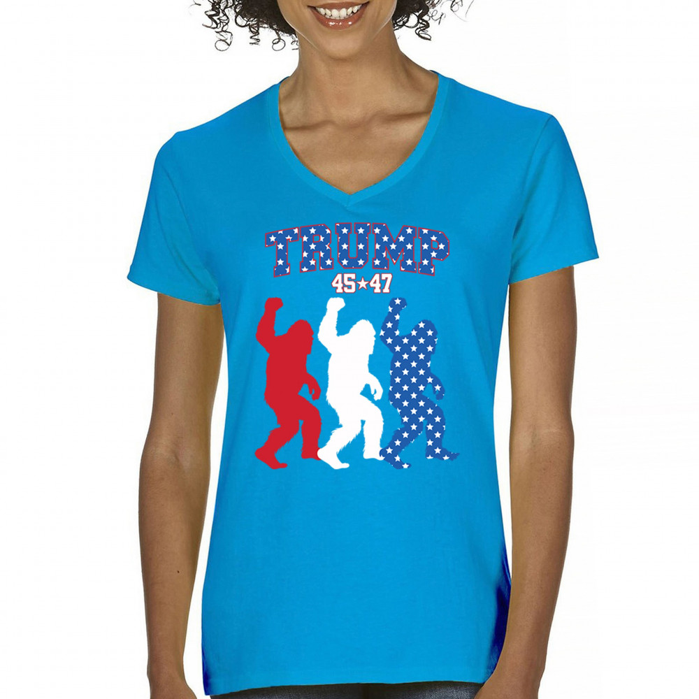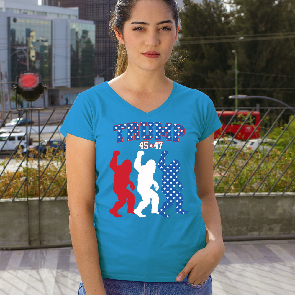 Trump 45/47 Bigfoot design in red, white, and blue with American flag stars. Celebrate patriotism, humor, and the fight for America First values.