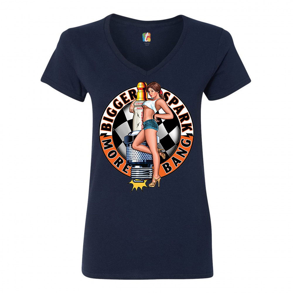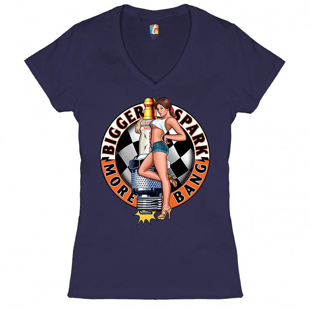 BIGGER SPARK MORE BANG women's v-neck t-shirt pin-up girl vintage racing tee navy blue