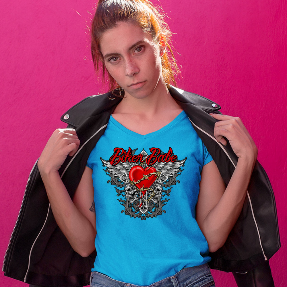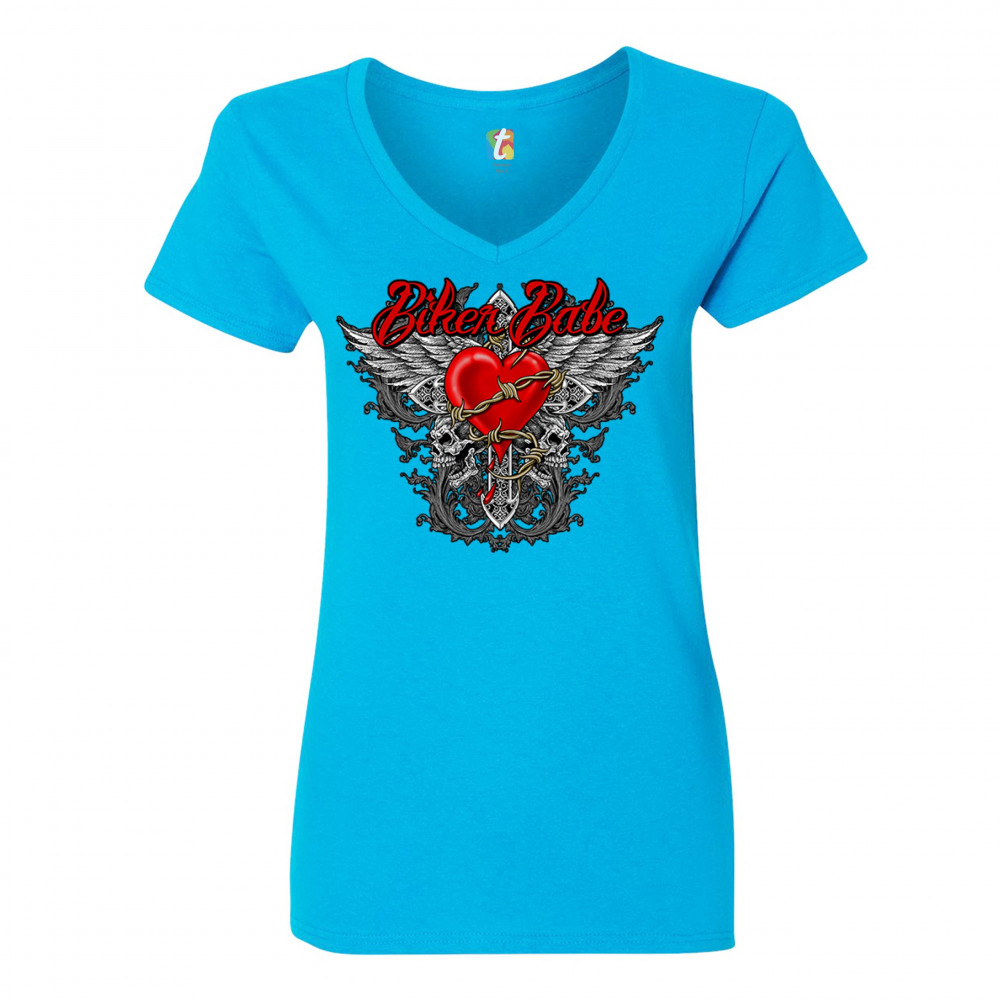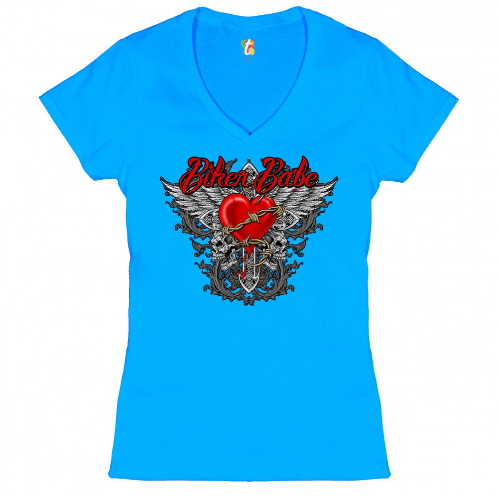 BIKER BABE women's v-neck t-shirt motorcycle chick live to ride tee turquoise