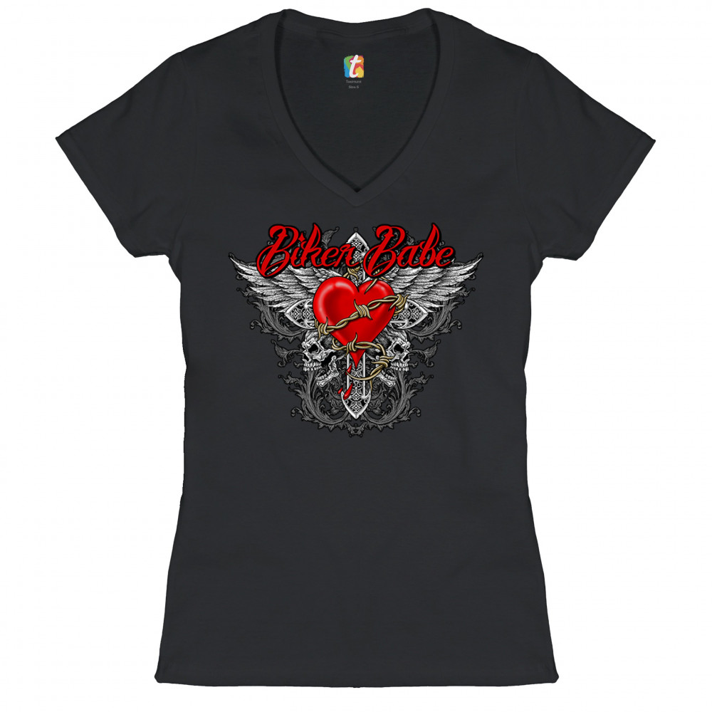 A print saying: "biker babe" and featuring a cross, wings, two skulls and a bleeding heart, all tied together by barbed wire. A great choice for a motorcycle enthusiast.