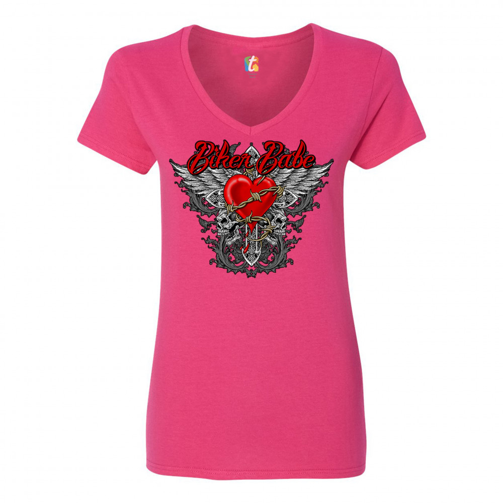 BIKER BABE women's v-neck t-shirt motorcycle chick live to ride tee pink