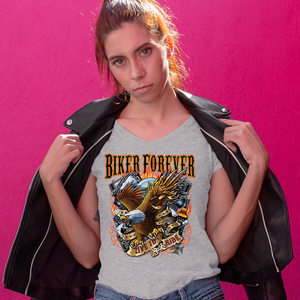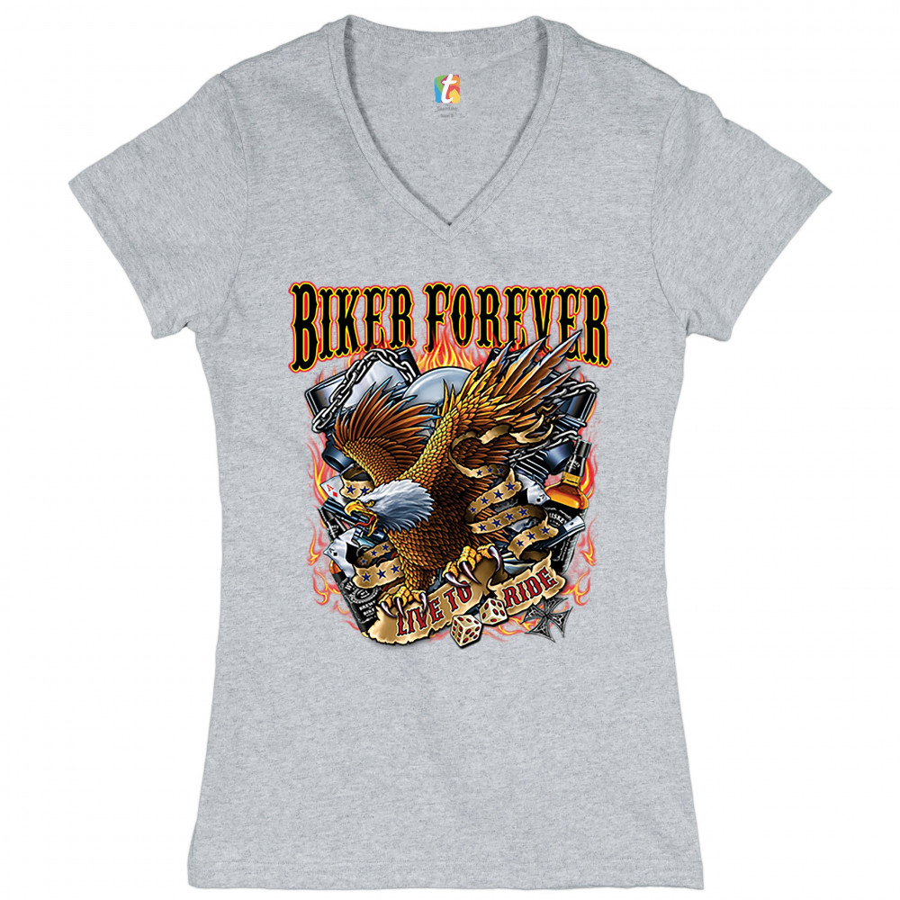 BIKER FOREVER LIVE TO RIDE women's v-neck t-shirt bald eagle motorcycle tee gray