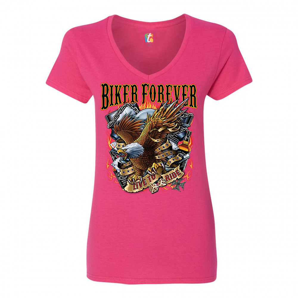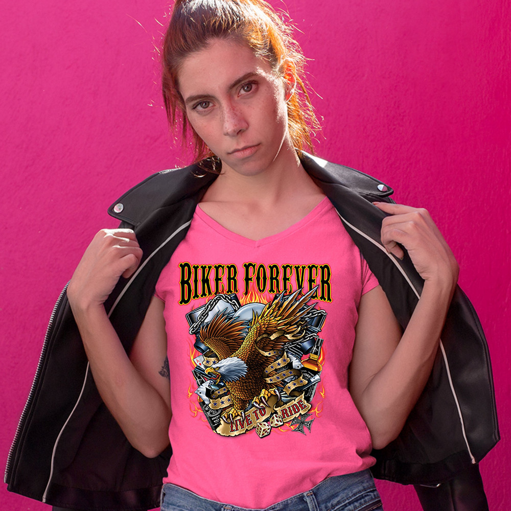 BIKER FOREVER LIVE TO RIDE women's v-neck t-shirt bald eagle motorcycle tee pink