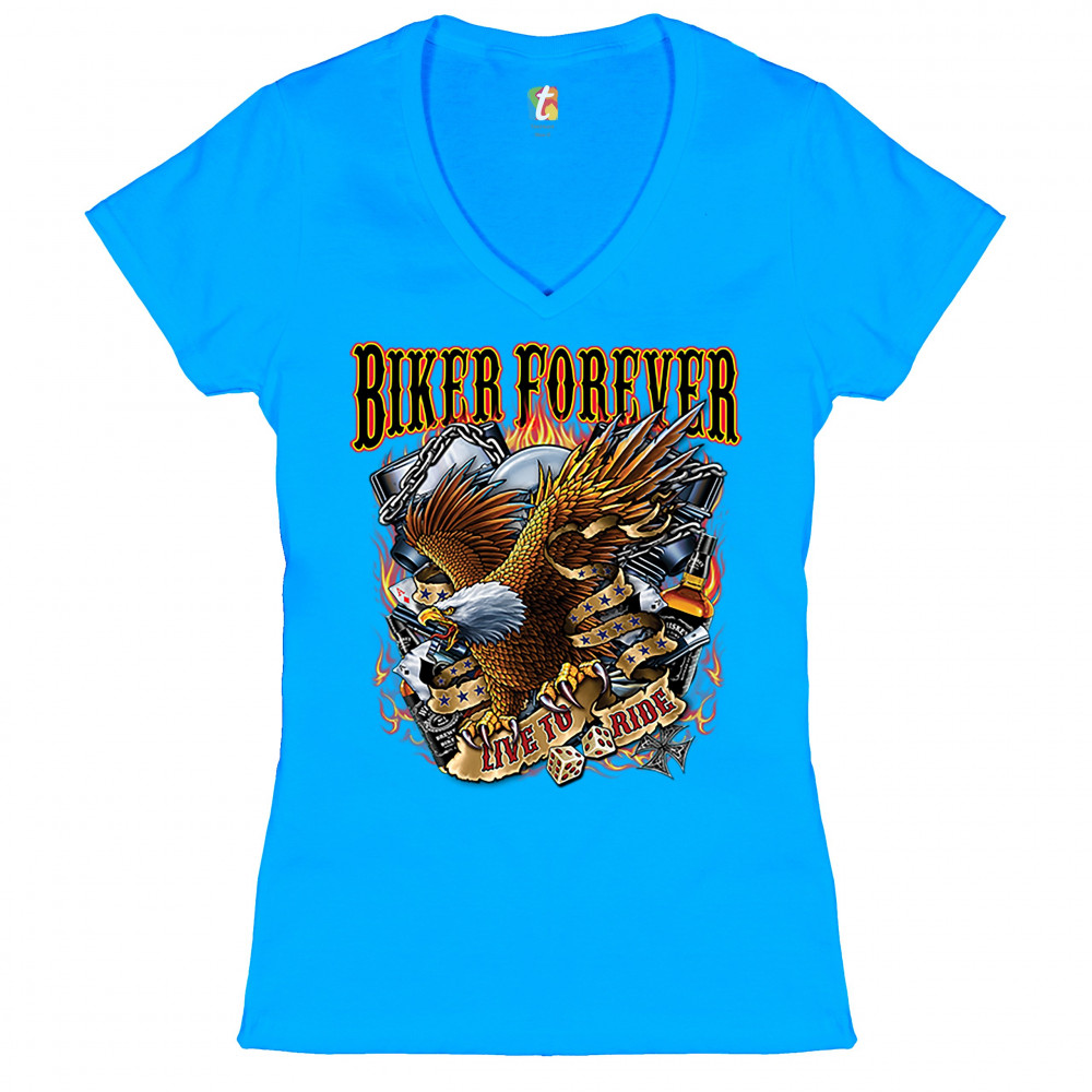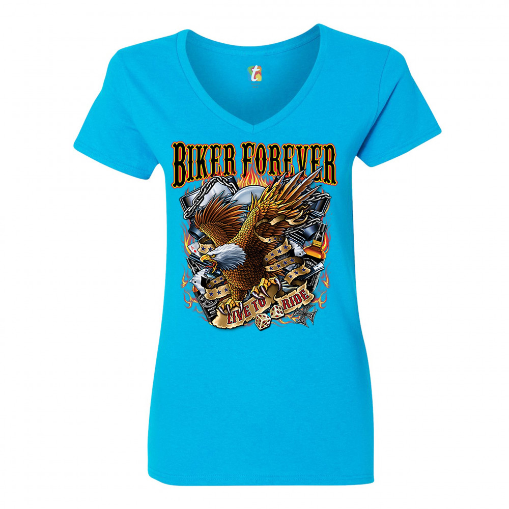 BIKER FOREVER LIVE TO RIDE women's v-neck t-shirt bald eagle motorcycle tee turquoise