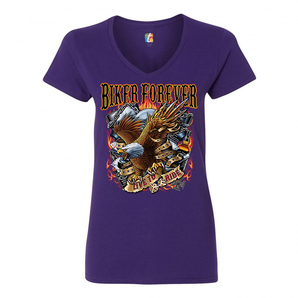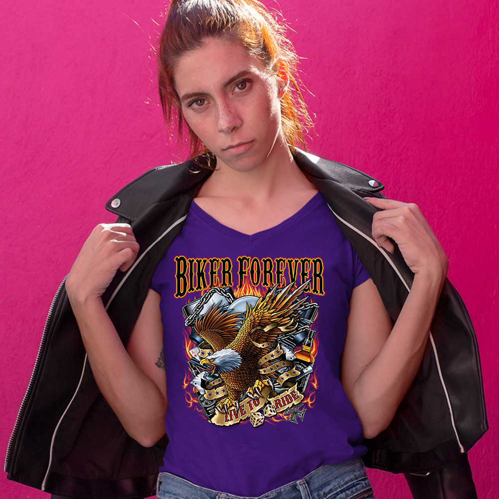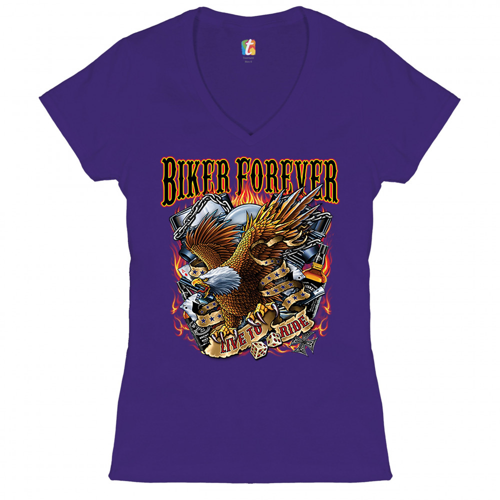 BIKER FOREVER LIVE TO RIDE women's v-neck t-shirt bald eagle motorcycle tee purple