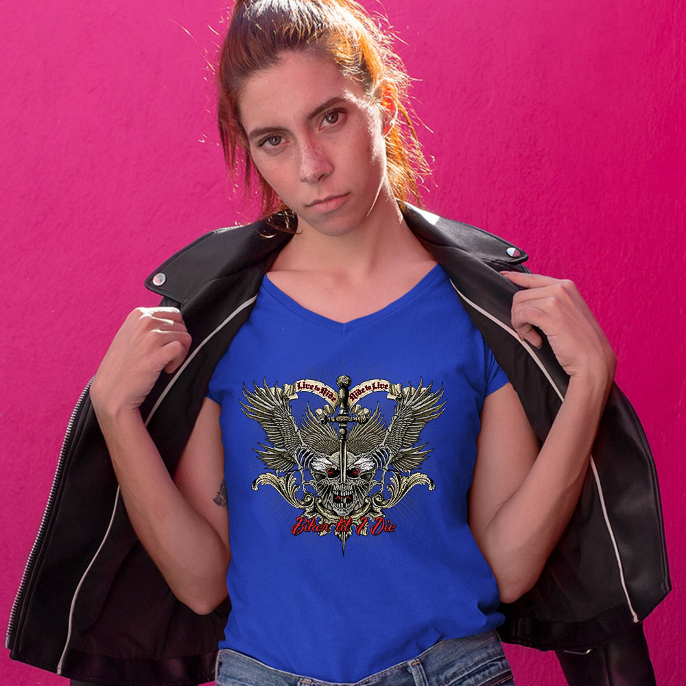 BIKER TIL I DIE women's v-neck t-shirt live to ride biker forever skull tee royal blue