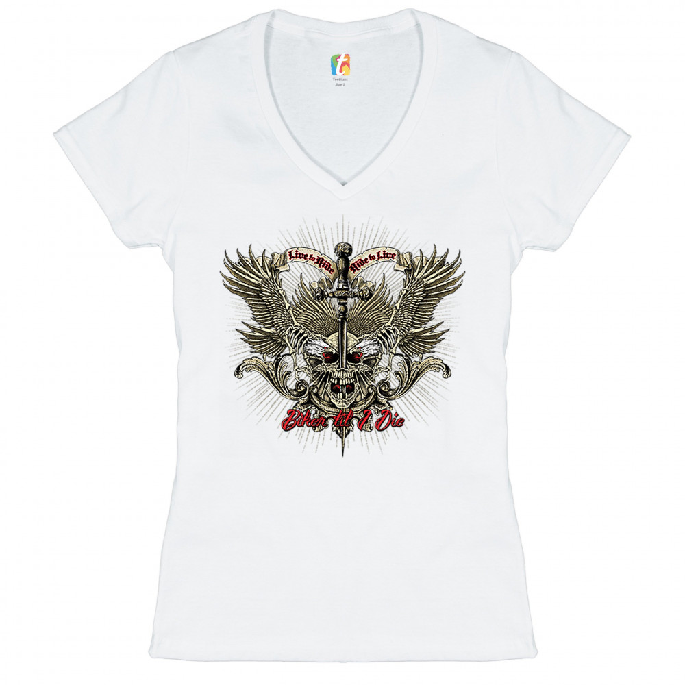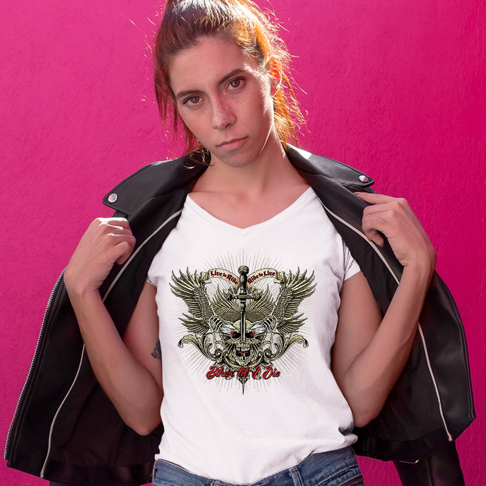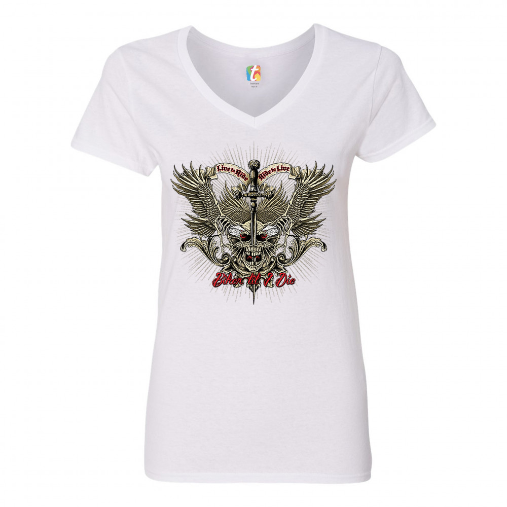 BIKER TIL I DIE women's v-neck t-shirt live to ride biker forever skull tee white