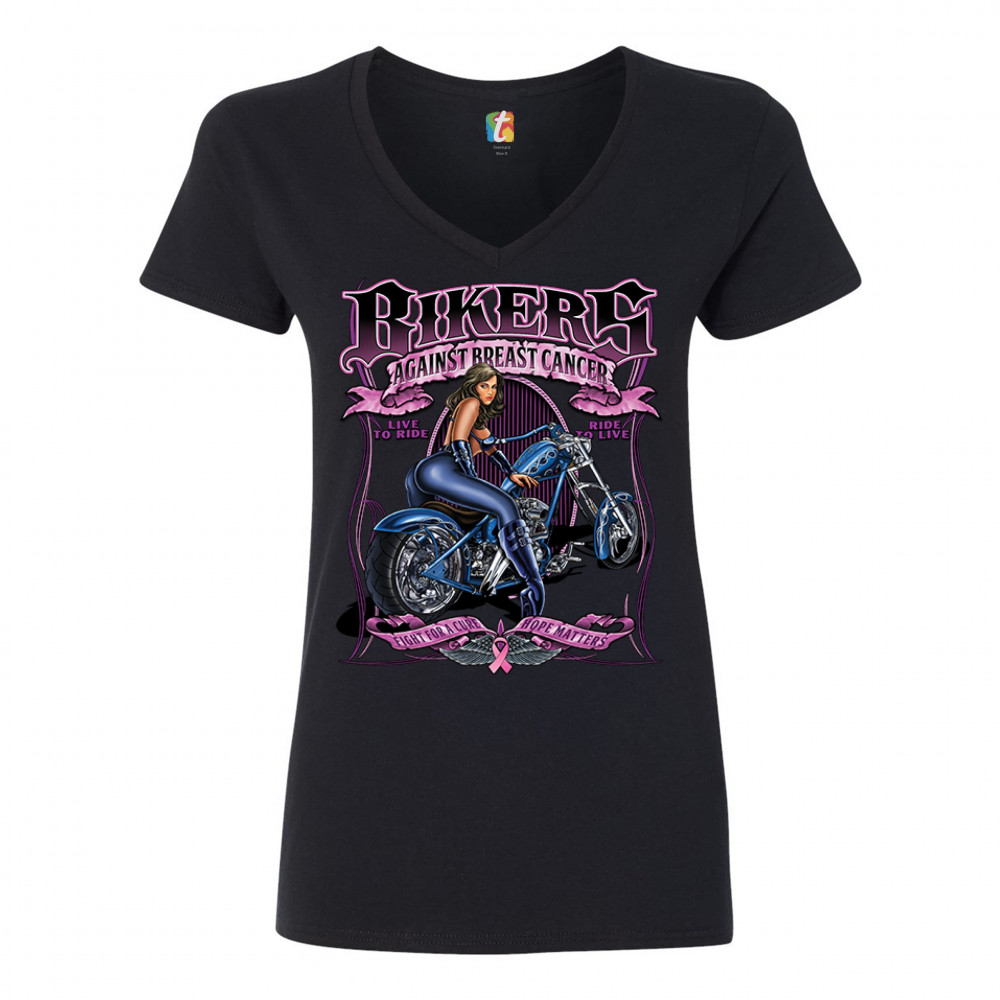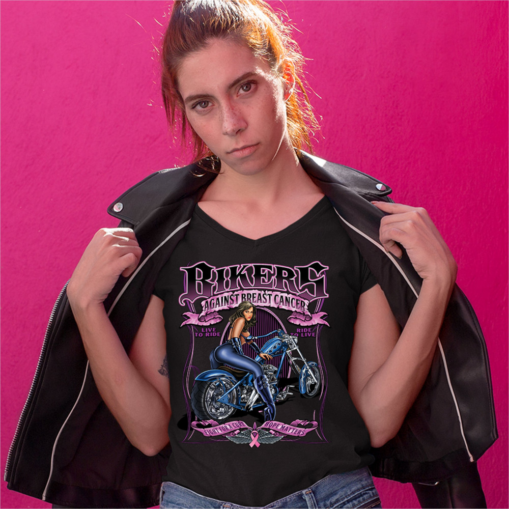 A print featuring a badass biker chick leaning on a chopper. The print says: "Bikers against breast cancer. Live to ride. Ride to live." At the bottom of the print there are two stripes with "fight for a cure, hope matters" written on them. Between the st
