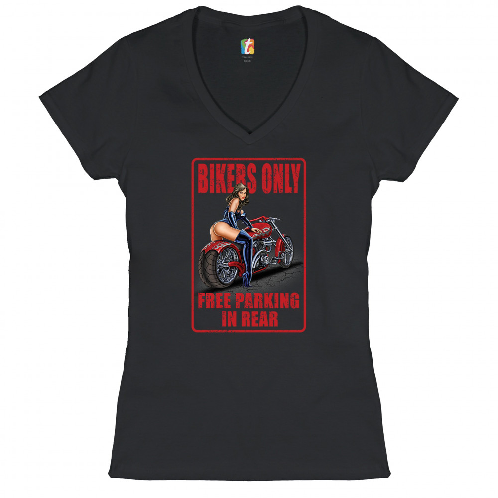 BIKERS ONLY FREE PARKING IN REAR women's v-neck t-shirt pin-up biker chick tee black