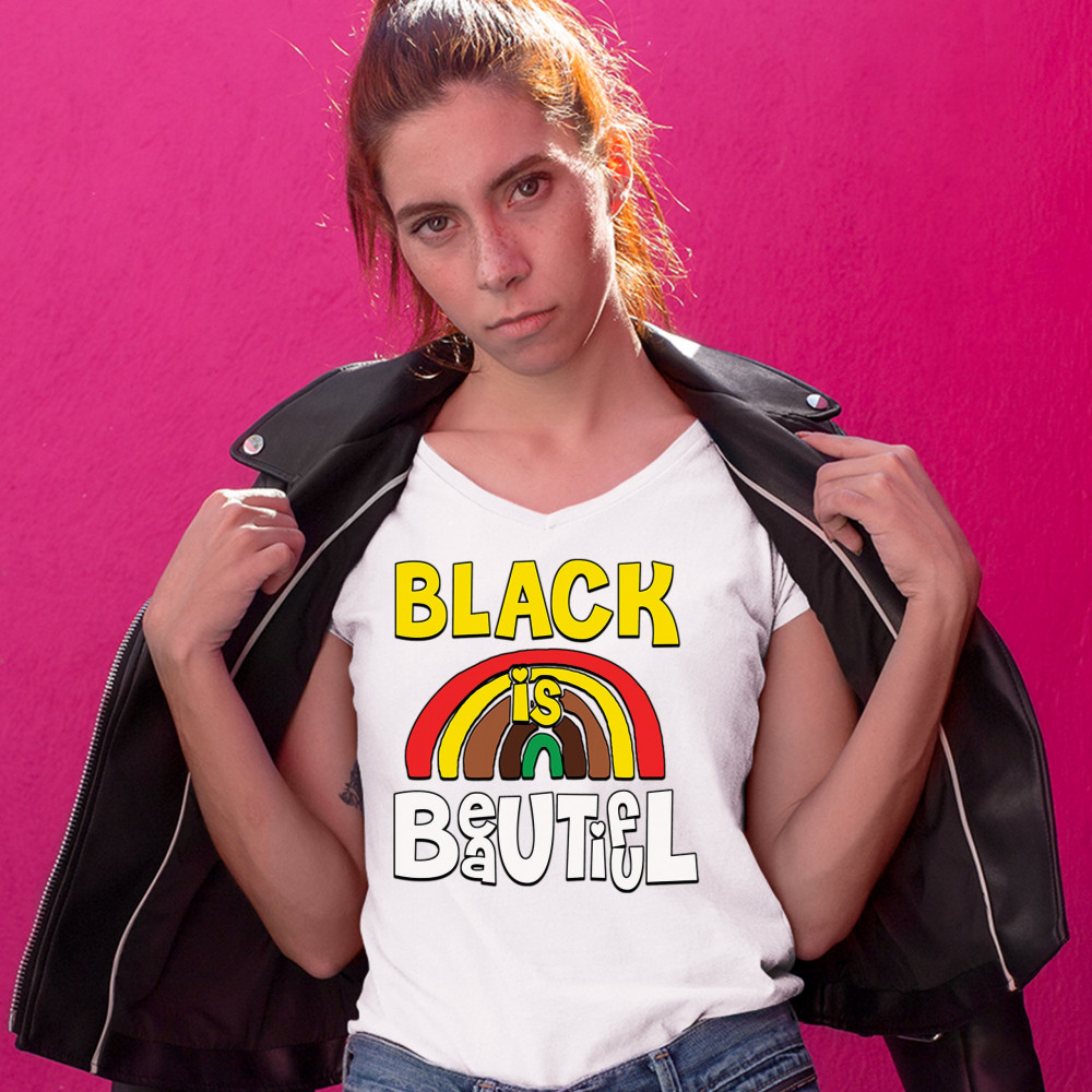 A political print depicting a rainbow painted in the Pan-African colors. The print also features a phrase: "Black is beautiful" written in a childish manner. Great choice to wear to spread an important message.