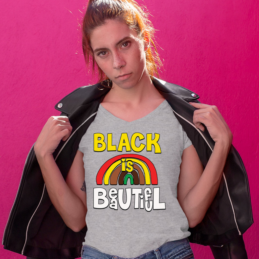 A political print depicting a rainbow painted in the Pan-African colors. The print also features a phrase: "Black is beautiful" written in a childish manner. Great choice to wear to spread an important message.