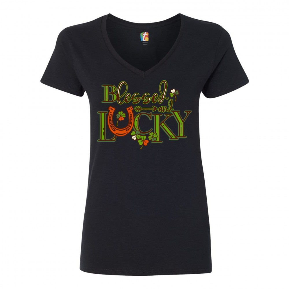 BLESSED AND LUCKY women's v-neck t-shirt st. patrick's day clover irish tee black