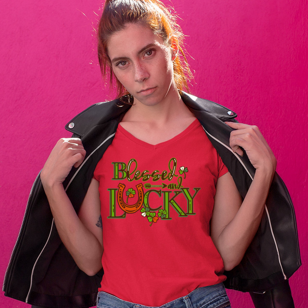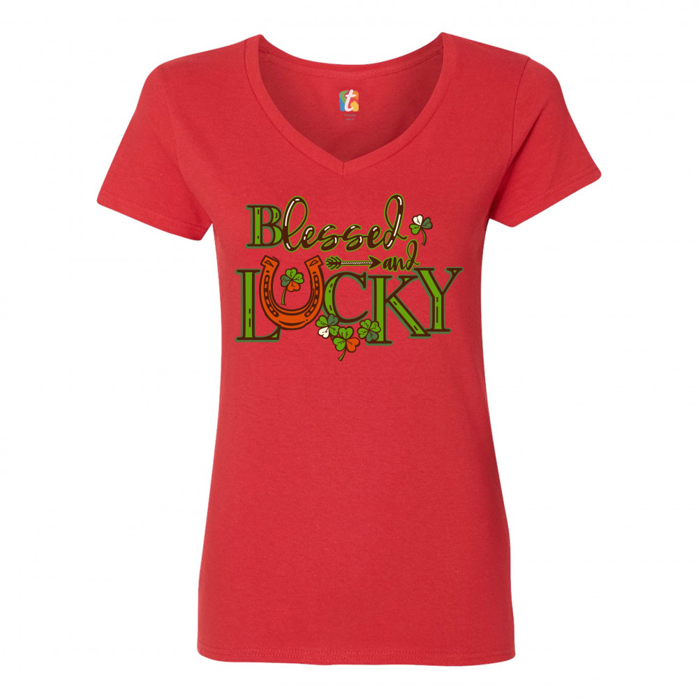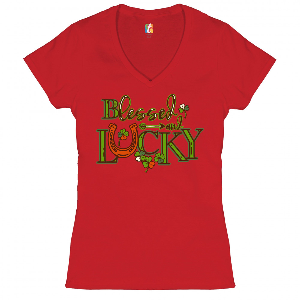 BLESSED AND LUCKY women's v-neck t-shirt st. patrick's day clover irish tee red