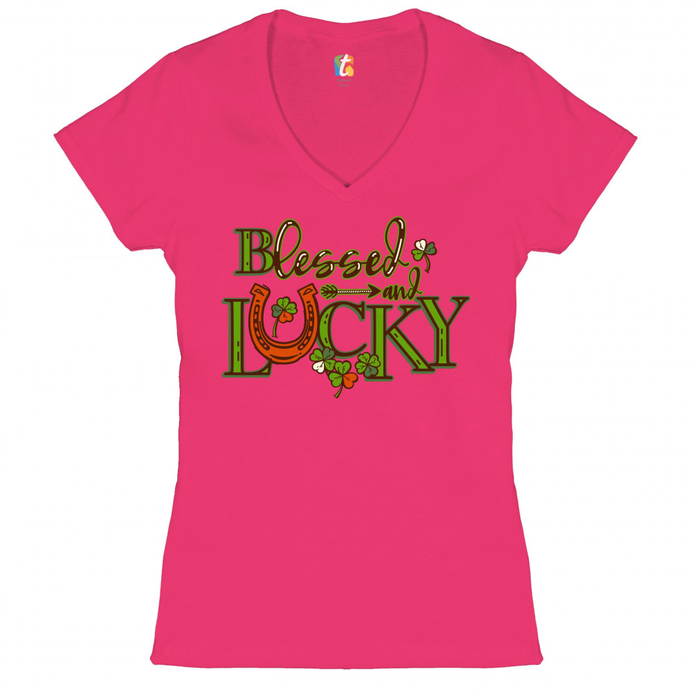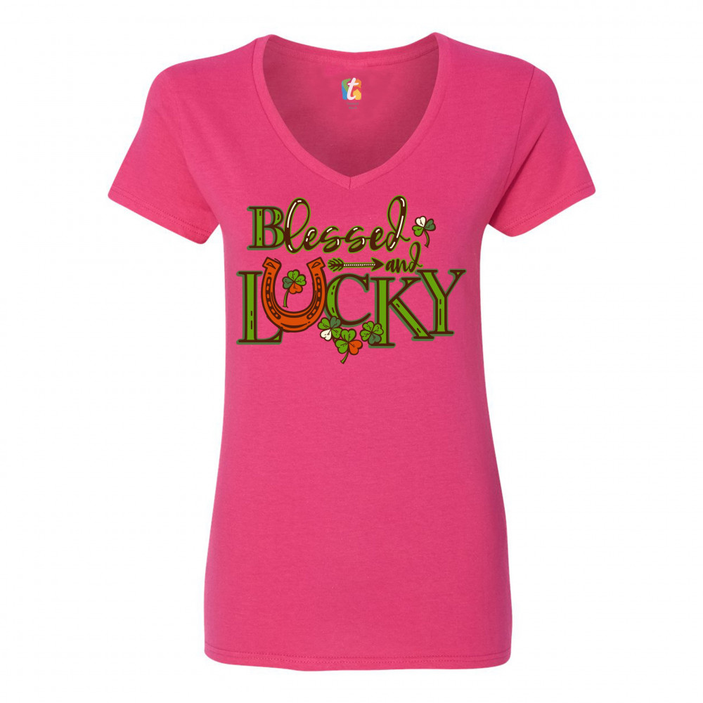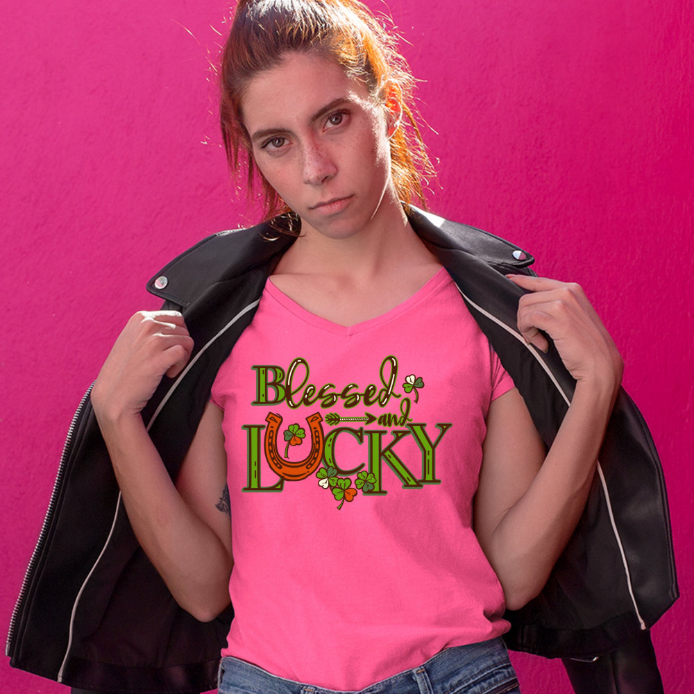 BLESSED AND LUCKY women's v-neck t-shirt st. patrick's day clover irish tee pink