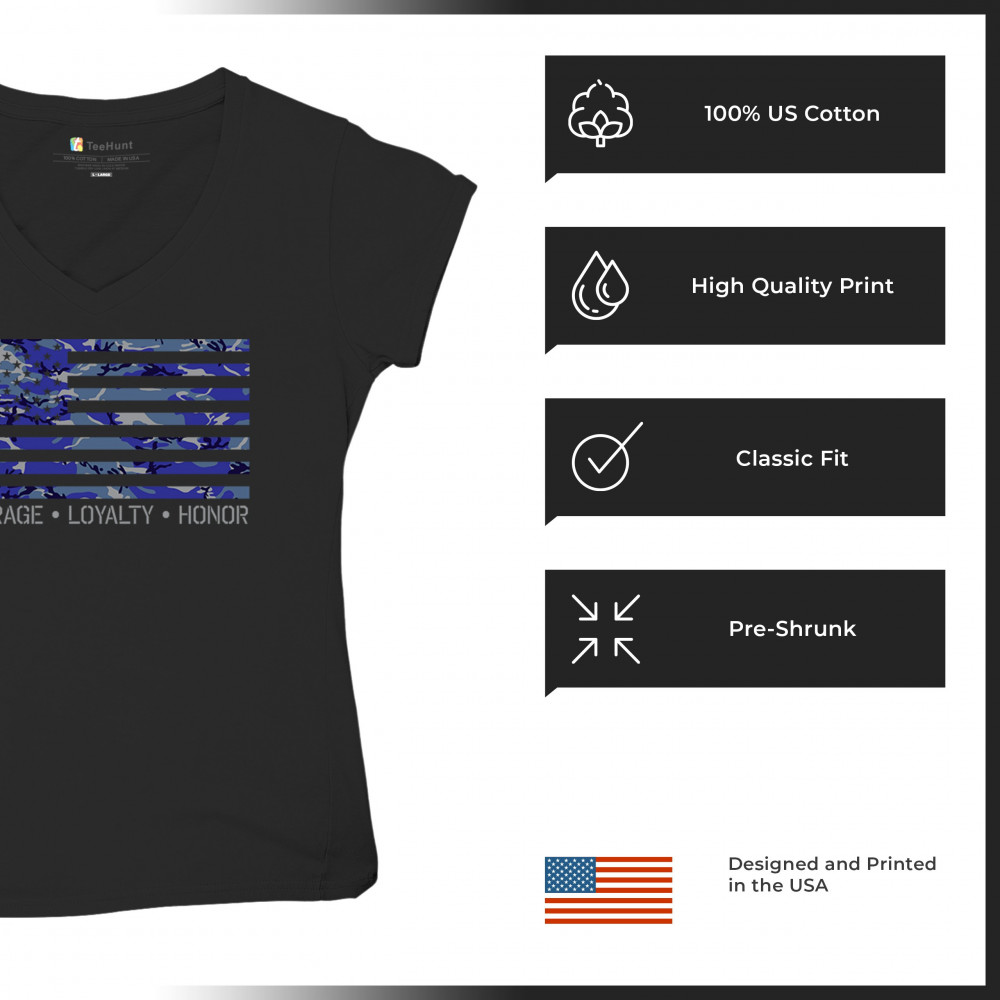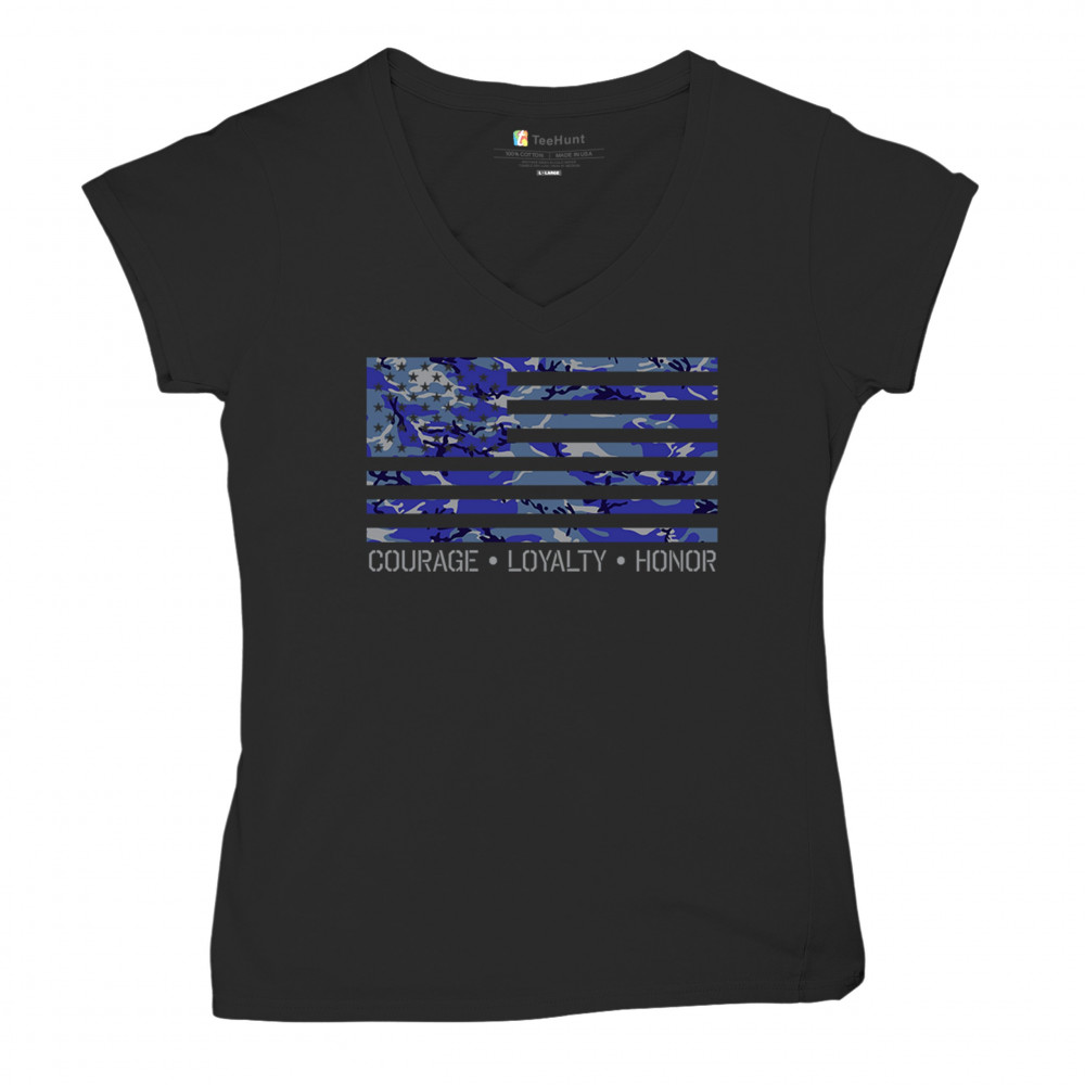 Patriotic shirt with blue camouflage USA flag and "Courage, Loyalty, Honor". Perfect for veterans and proud Americans. Ideal for Memorial Day and Veterans Day.