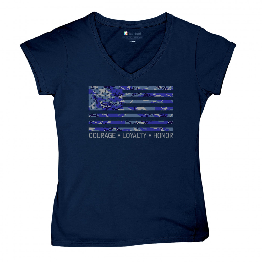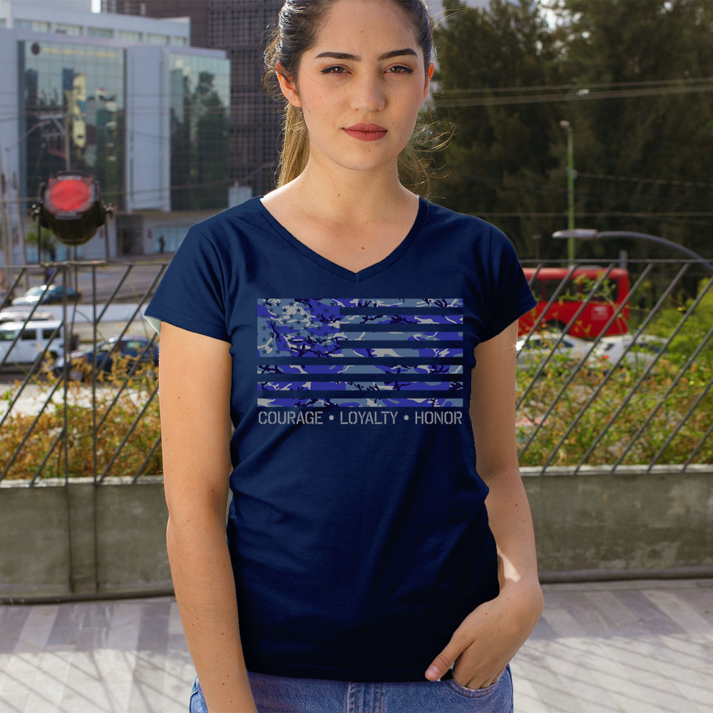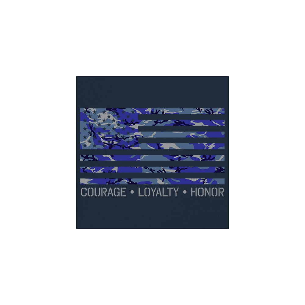 Patriotic shirt with blue camouflage USA flag and "Courage, Loyalty, Honor". Perfect for veterans and proud Americans. Ideal for Memorial Day and Veterans Day.