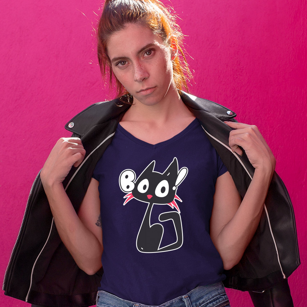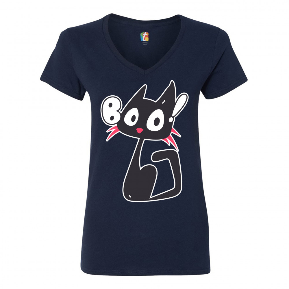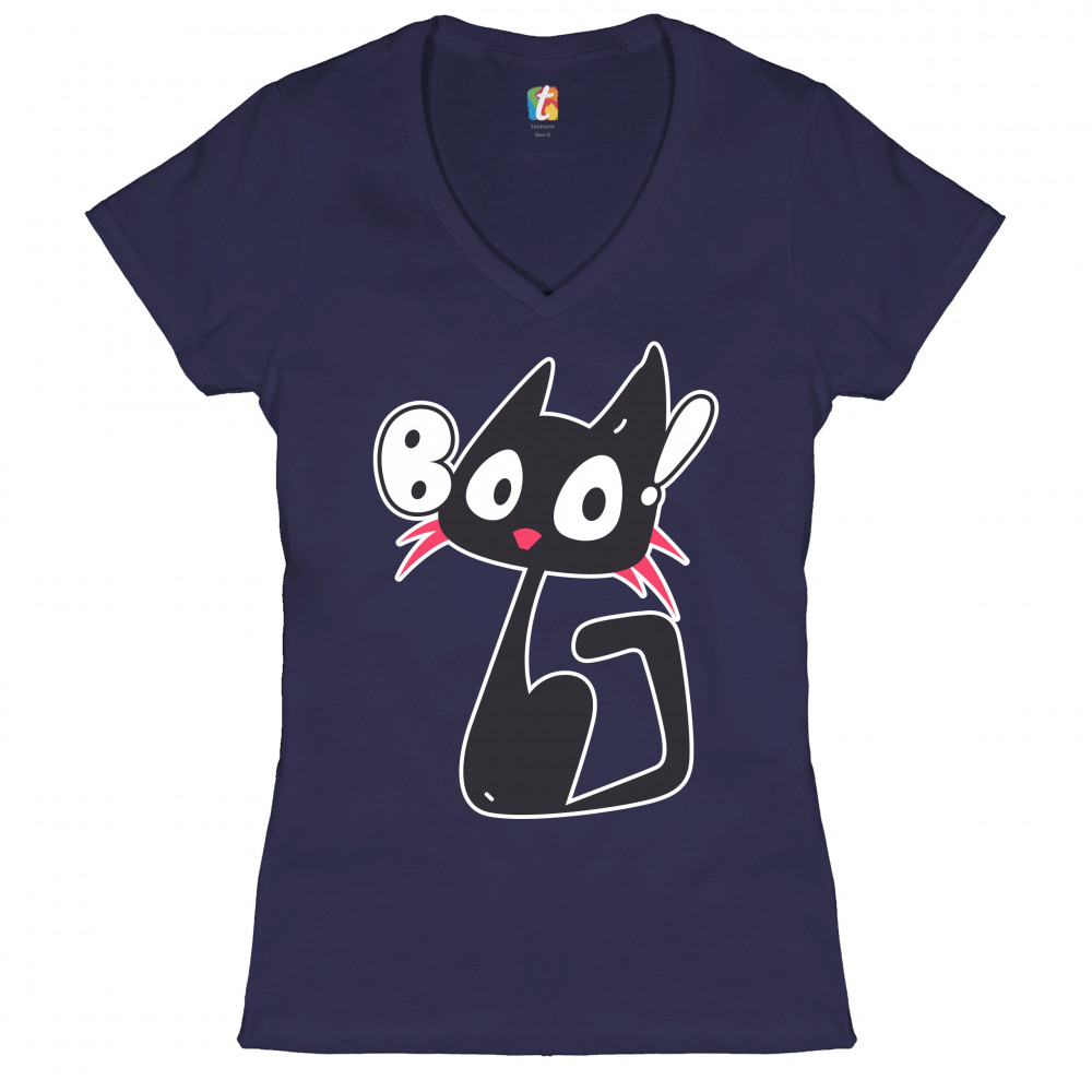 BOO KITTEN women's v-neck t-shirt happy halloween trick-or-treating cat tee navy blue