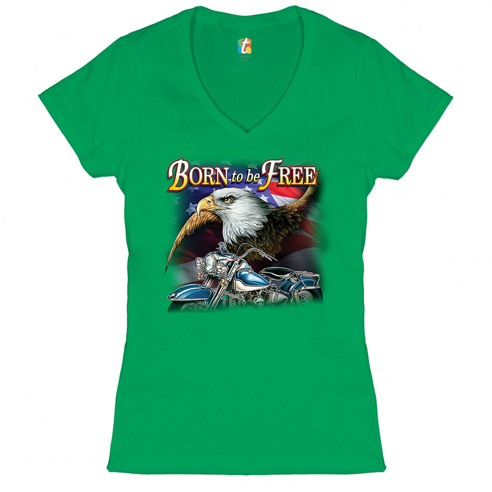 BORN TO BE FREE women's v-neck t-shirt american bald eagle chopper biker tee green