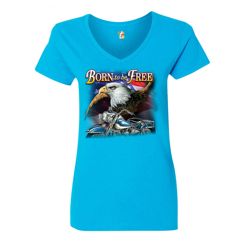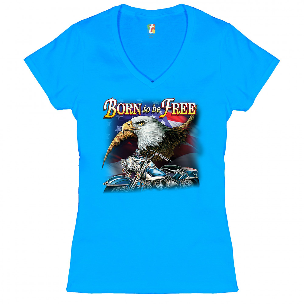 BORN TO BE FREE women's v-neck t-shirt american bald eagle chopper biker tee turquoise