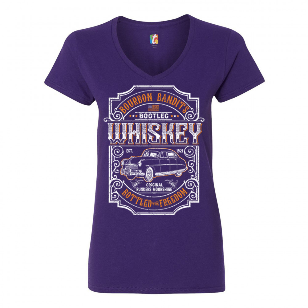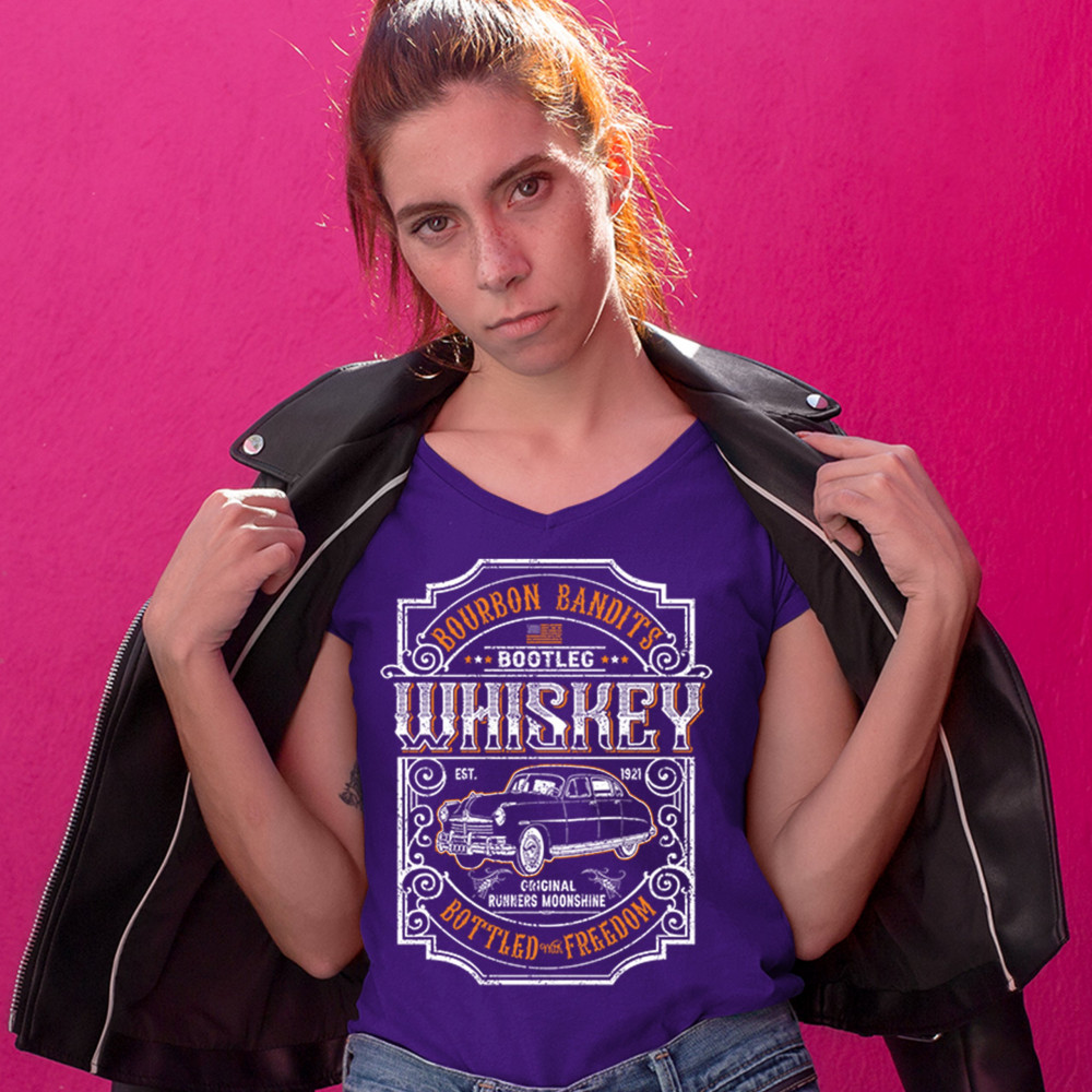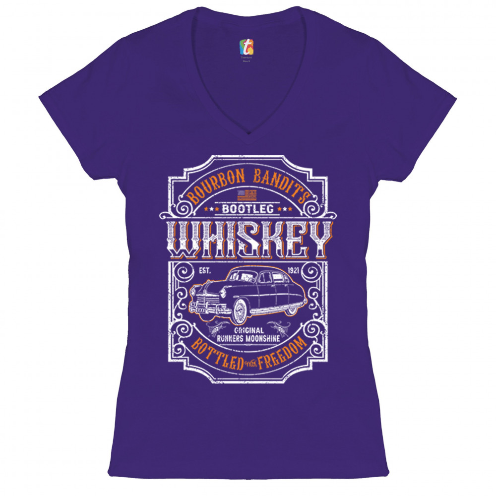 BOURBON BANDIT'S BOOTLEG WHISKEY women's v-neck t-shirt original moonshine tee purple
