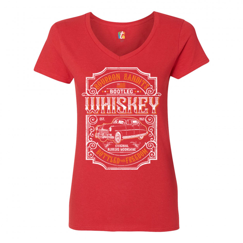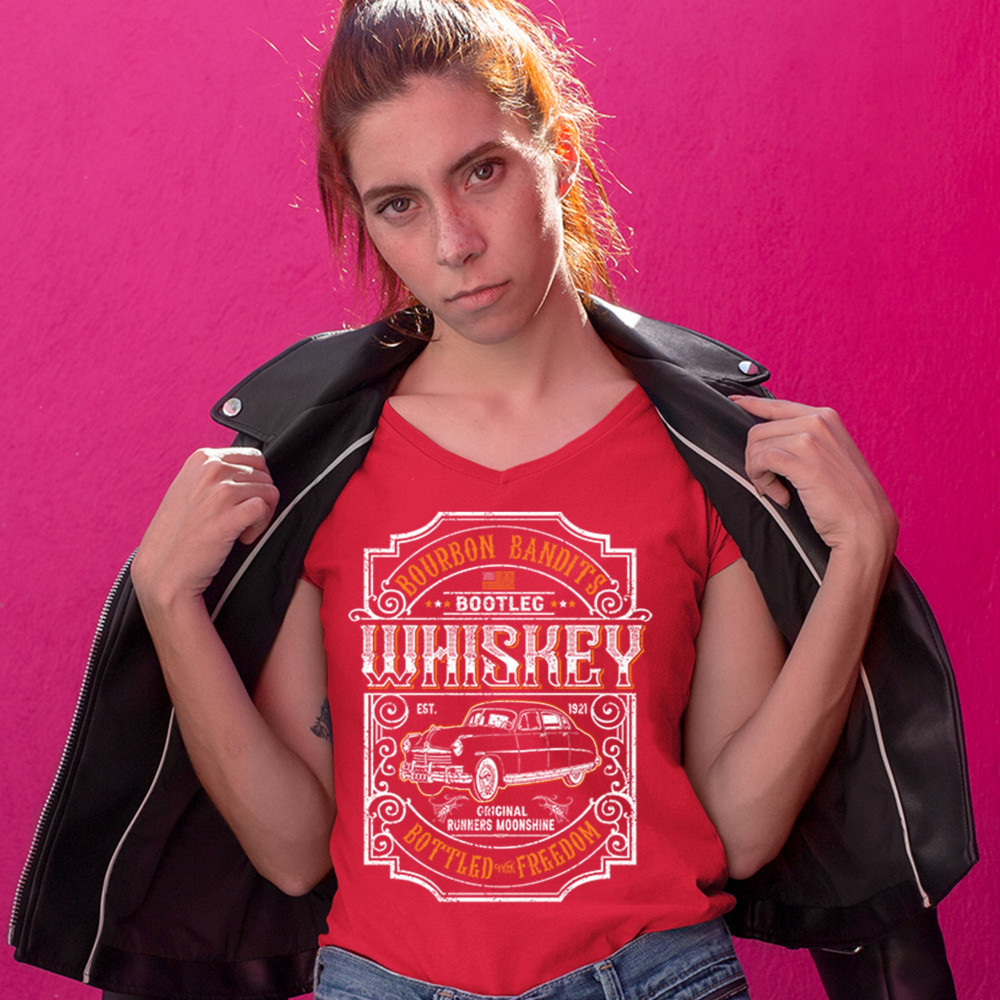 BOURBON BANDIT'S BOOTLEG WHISKEY women's v-neck t-shirt original moonshine tee red