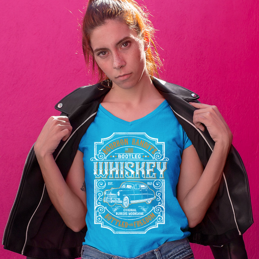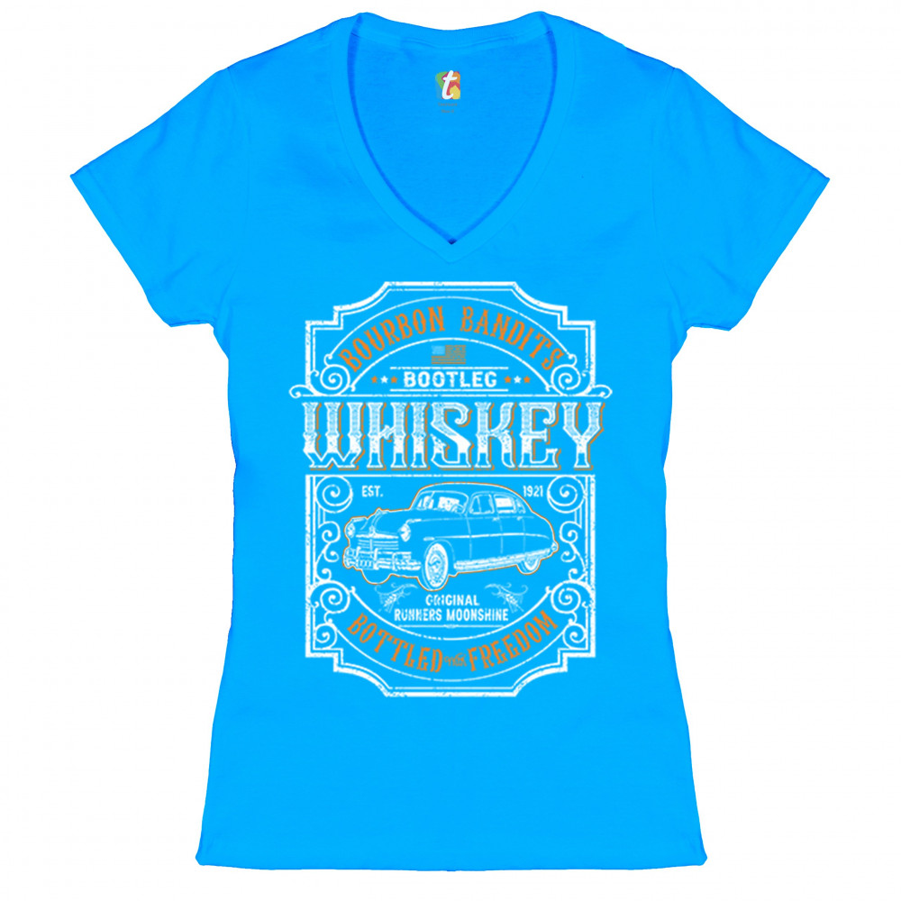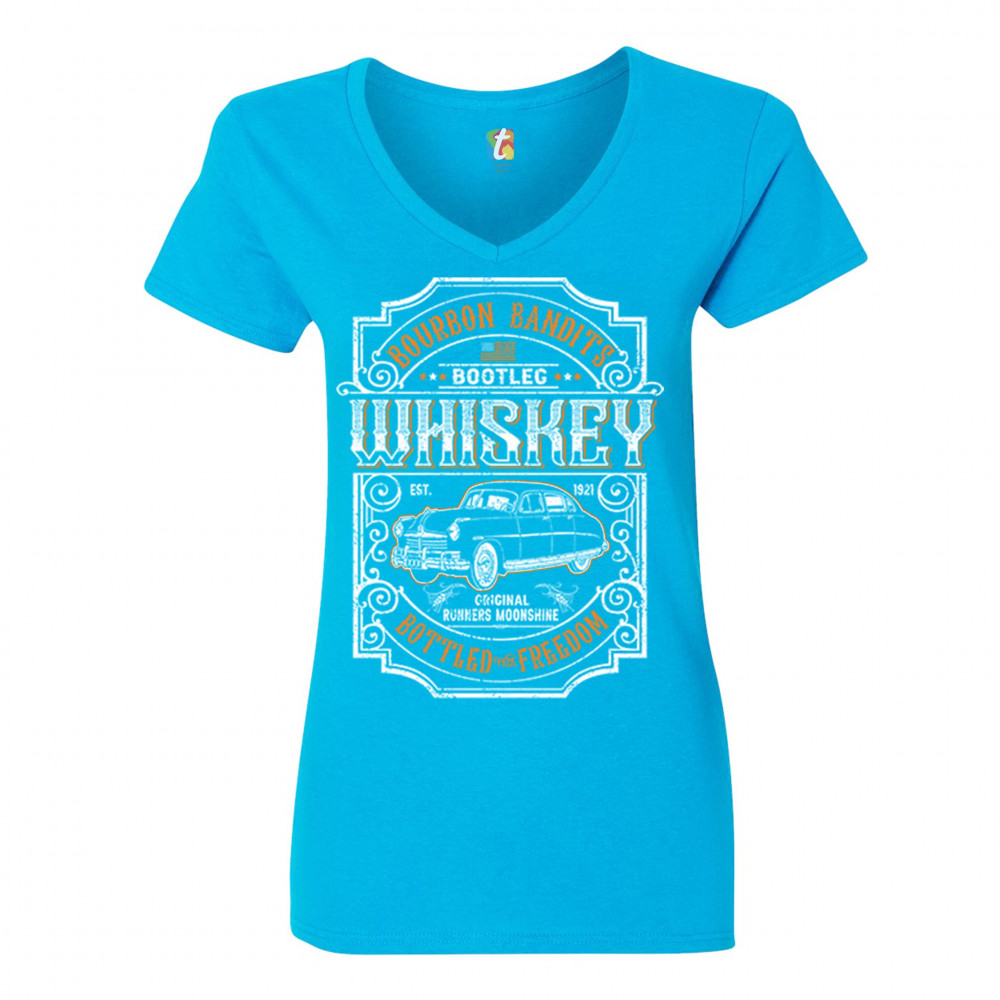 BOURBON BANDIT'S BOOTLEG WHISKEY women's v-neck t-shirt original moonshine tee turquoise