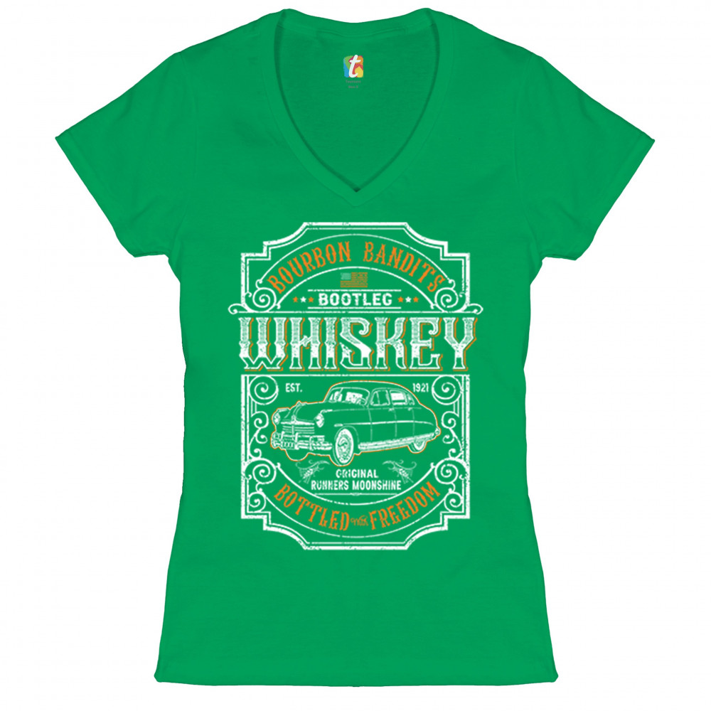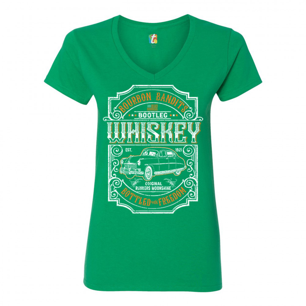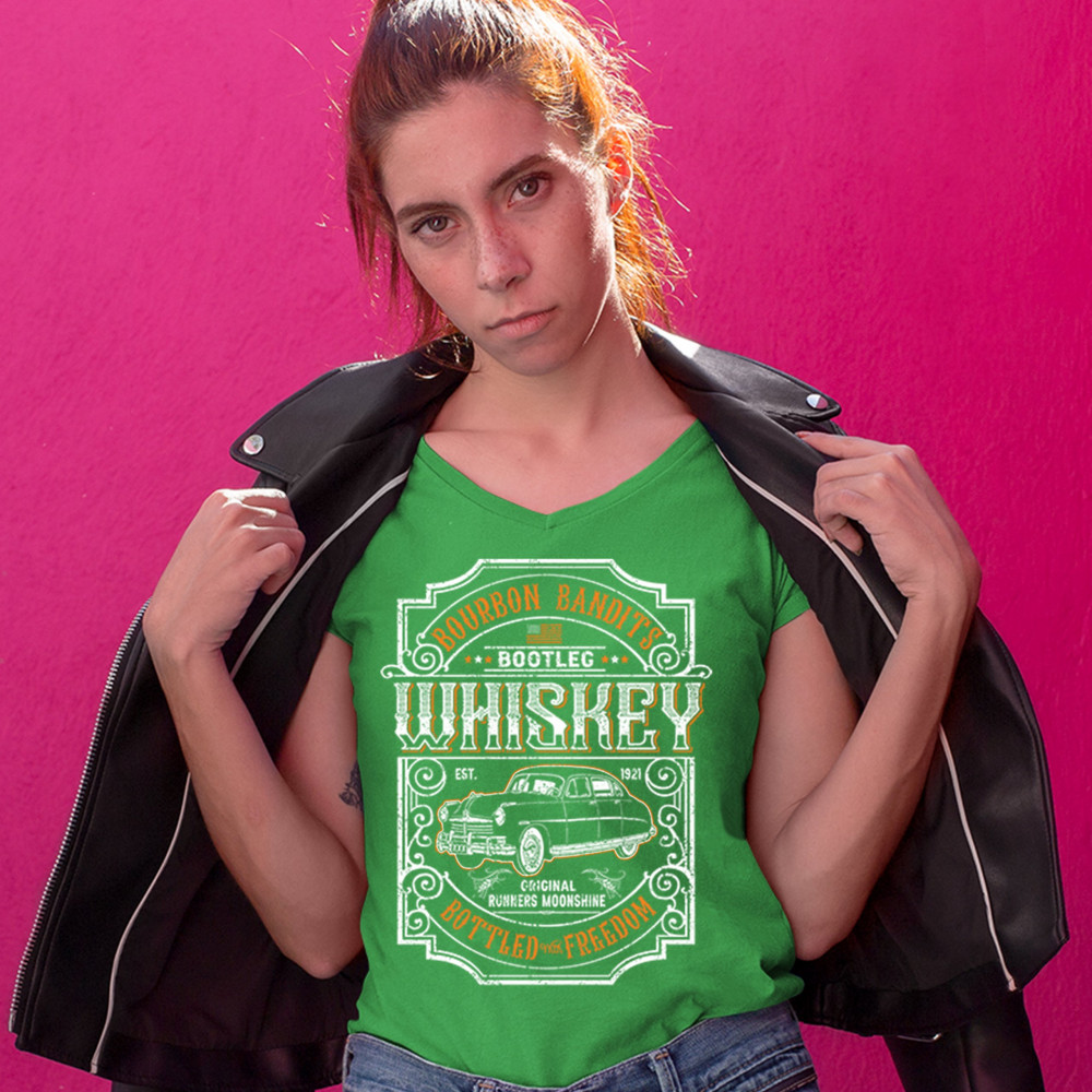 BOURBON BANDIT'S BOOTLEG WHISKEY women's v-neck t-shirt original moonshine tee green