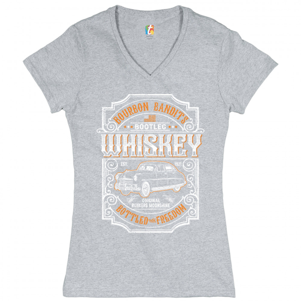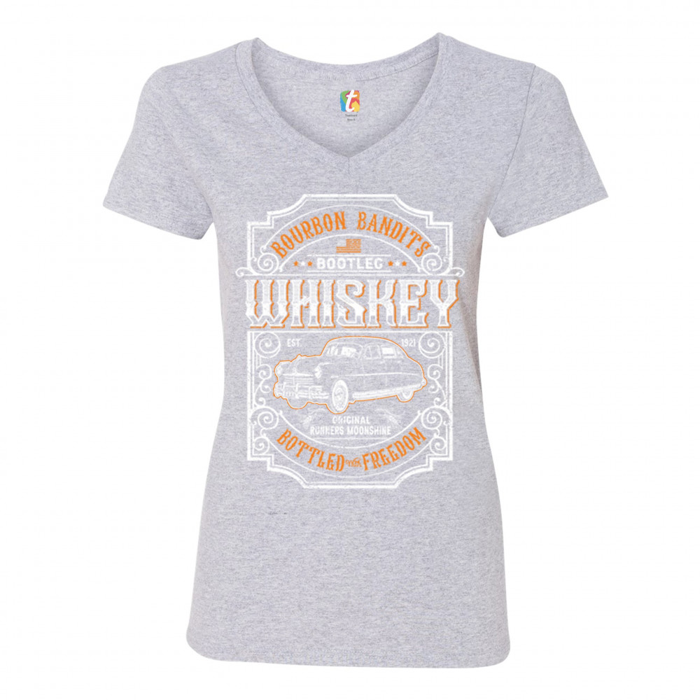 BOURBON BANDIT'S BOOTLEG WHISKEY women's v-neck t-shirt original moonshine tee gray