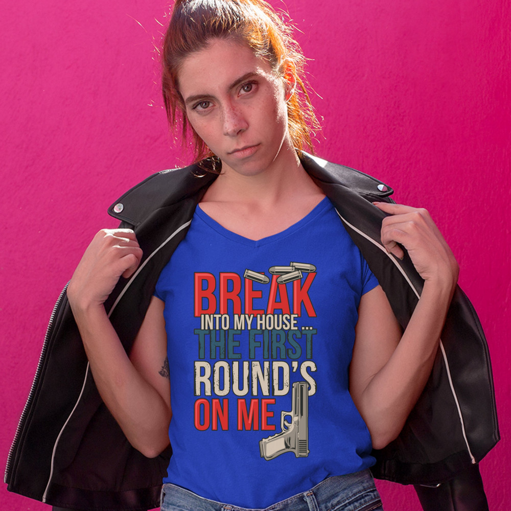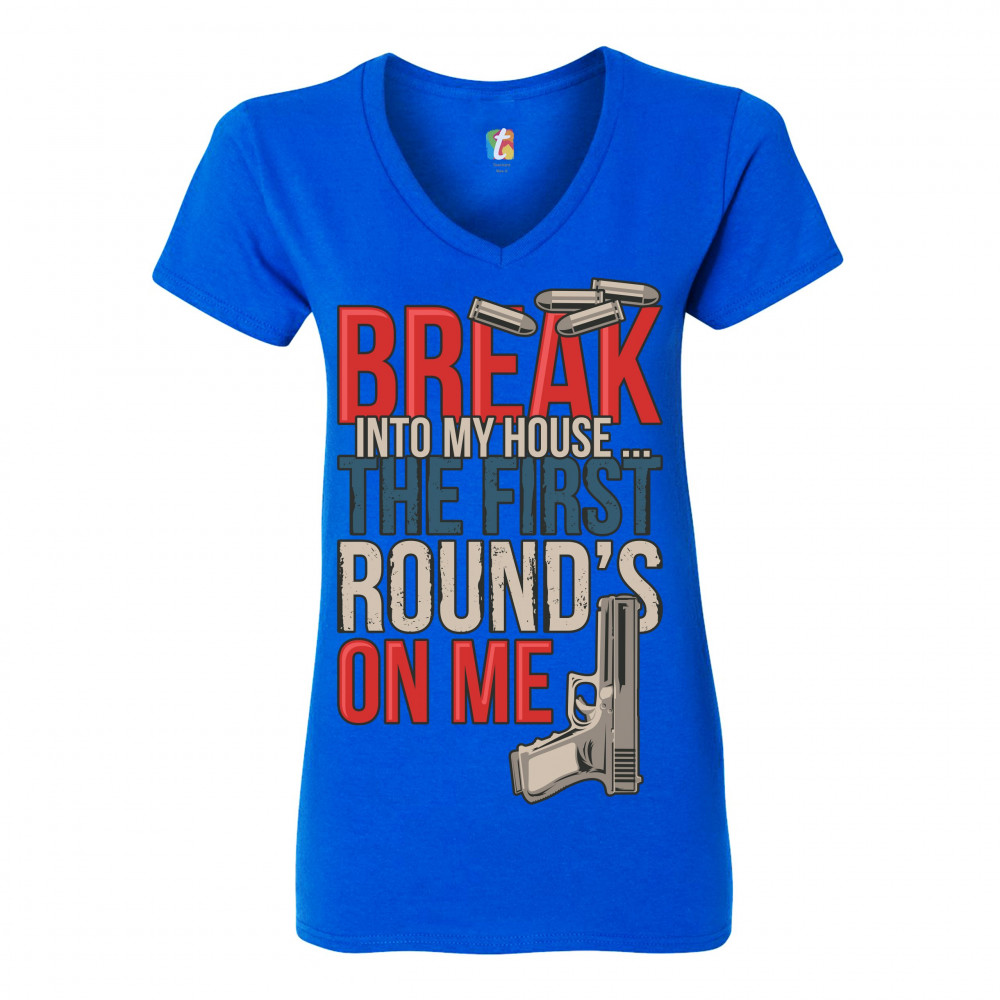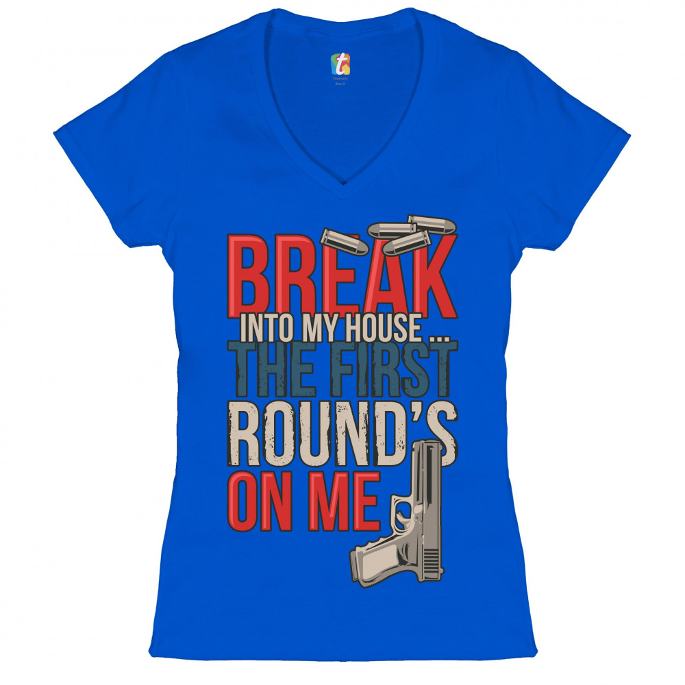 BREAK INTO MY HOUSE.. THE FIRST ROUND'S ON ME break into my house first round's on me women's v-neck t-shirt funny 2a tee royal blue