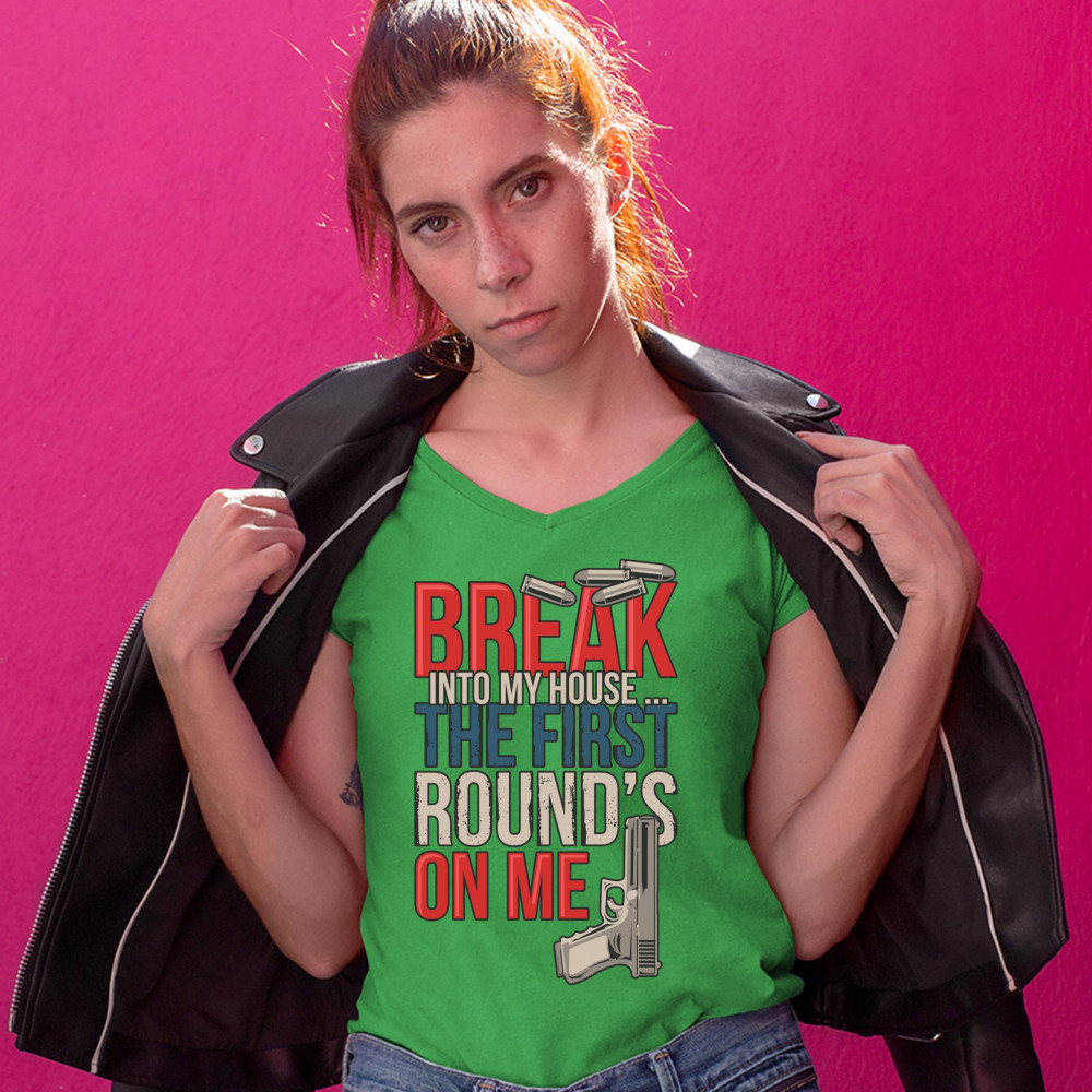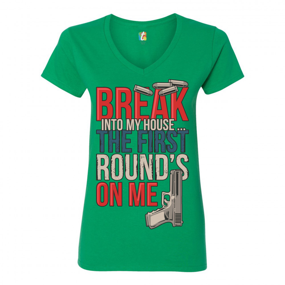 BREAK INTO MY HOUSE.. THE FIRST ROUND'S ON ME break into my house first round's on me women's v-neck t-shirt funny 2a tee green