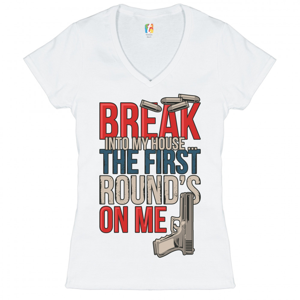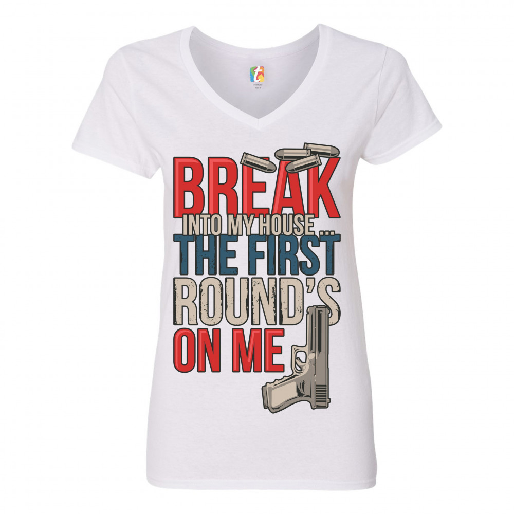 BREAK INTO MY HOUSE.. THE FIRST ROUND'S ON ME break into my house first round's on me women's v-neck t-shirt funny 2a tee white
