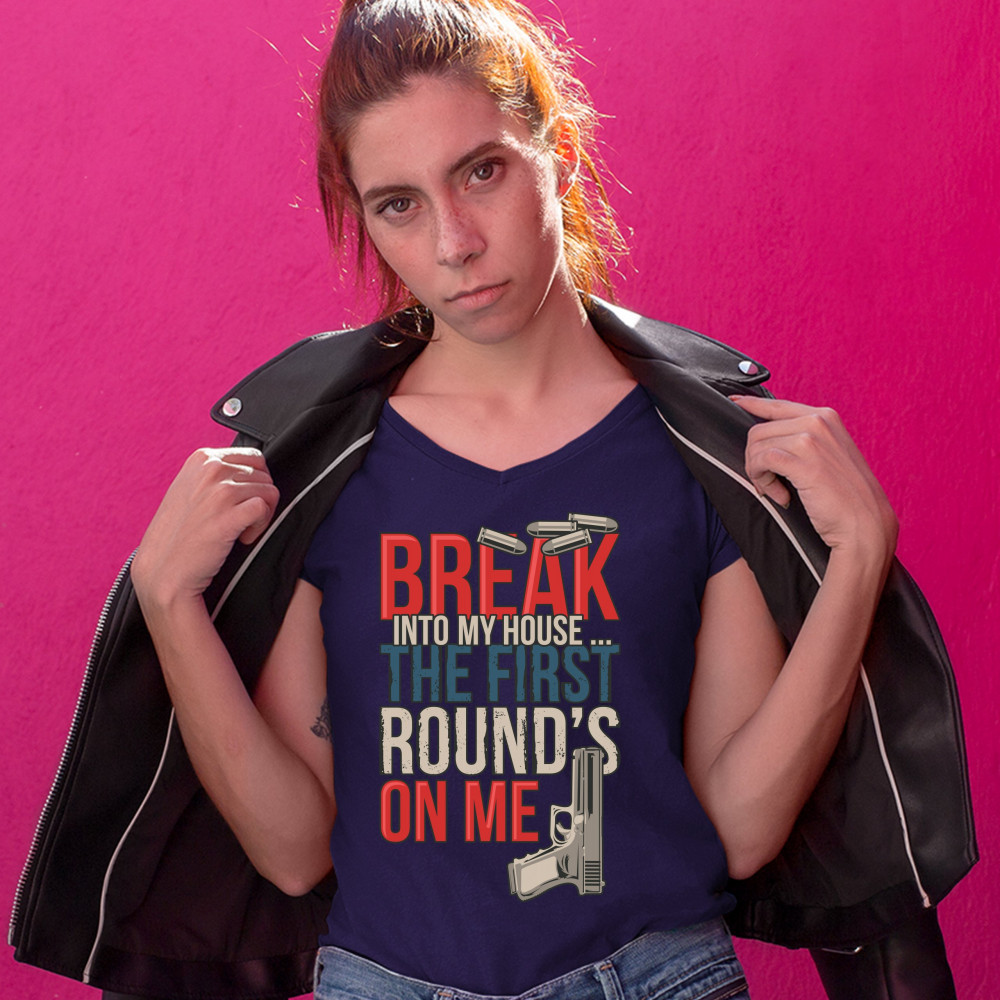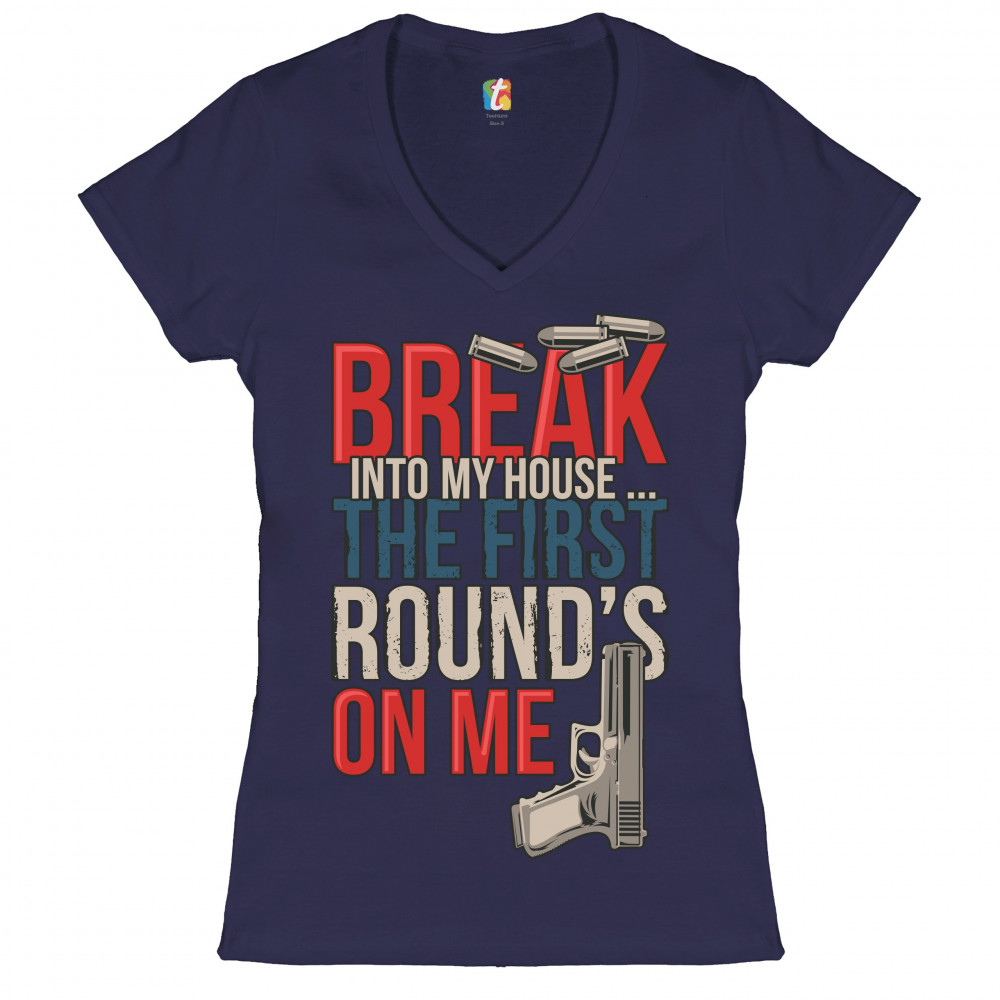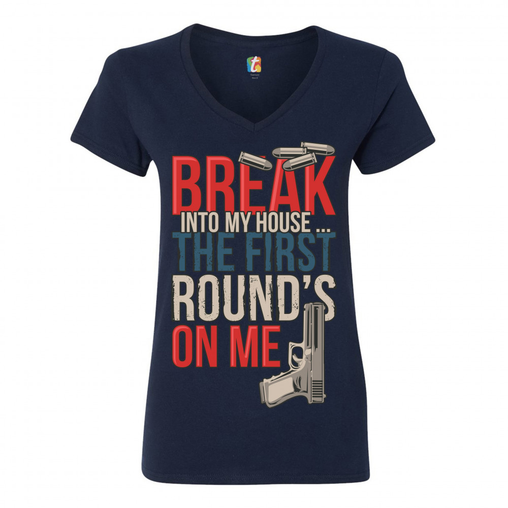 BREAK INTO MY HOUSE.. THE FIRST ROUND'S ON ME break into my house first round's on me women's v-neck t-shirt funny 2a tee navy blue