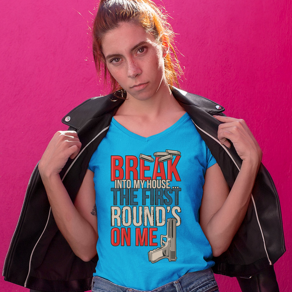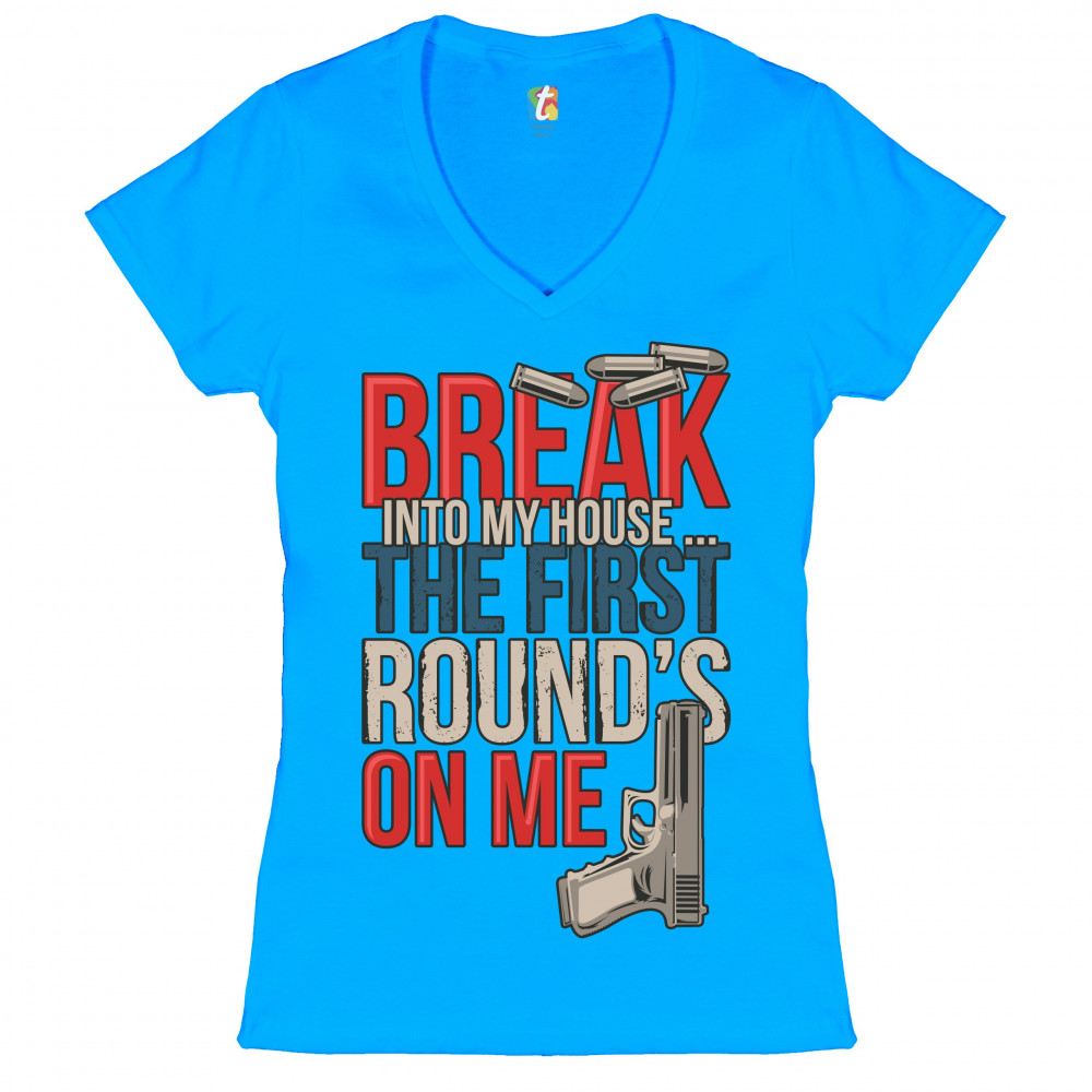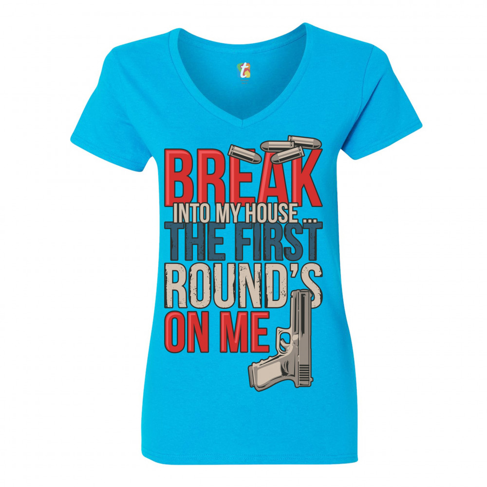BREAK INTO MY HOUSE.. THE FIRST ROUND'S ON ME break into my house first round's on me women's v-neck t-shirt funny 2a tee turquoise