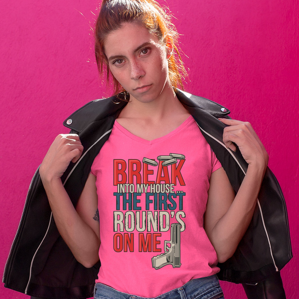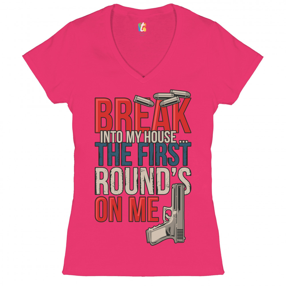 BREAK INTO MY HOUSE.. THE FIRST ROUND'S ON ME break into my house first round's on me women's v-neck t-shirt funny 2a tee pink