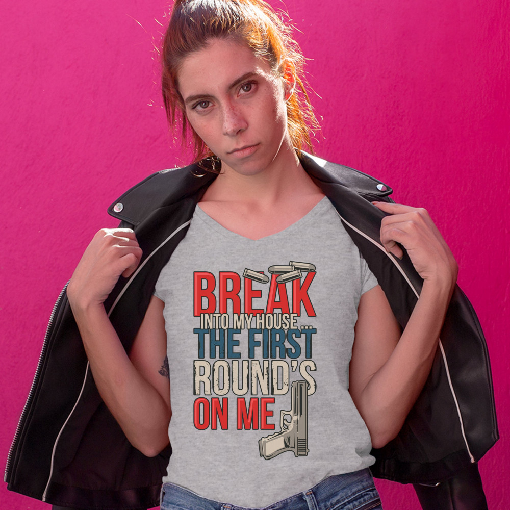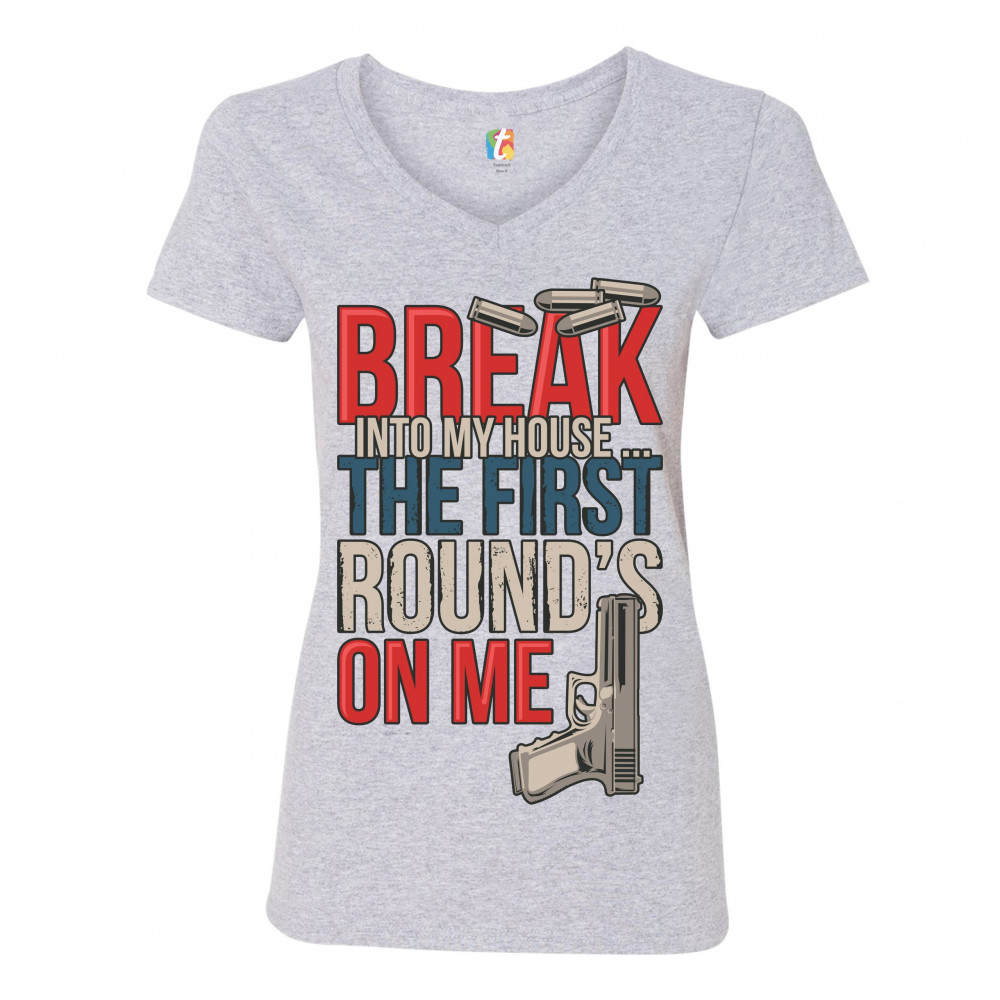 BREAK INTO MY HOUSE.. THE FIRST ROUND'S ON ME break into my house first round's on me women's v-neck t-shirt funny 2a tee gray