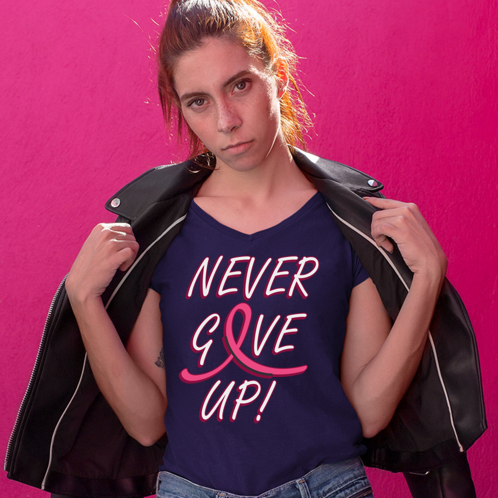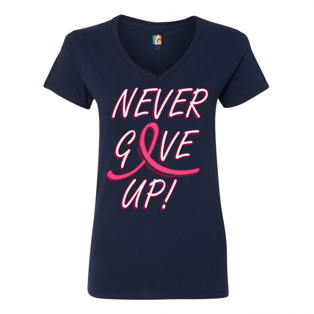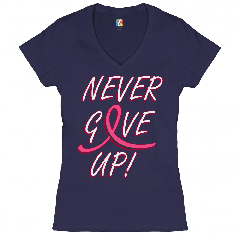 BREAST CANCER AWARENESS NEVER GIVE UP women's v-neck t-shirt pink ribbon tee navy blue