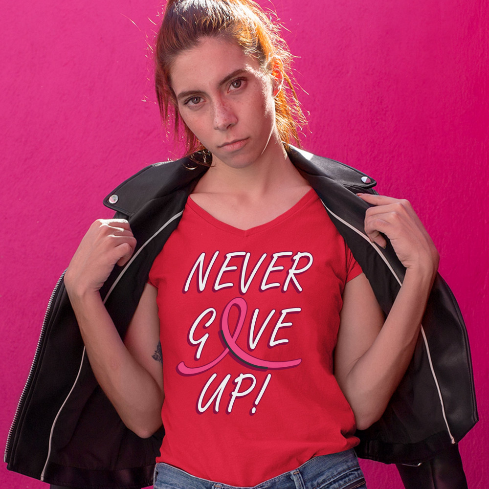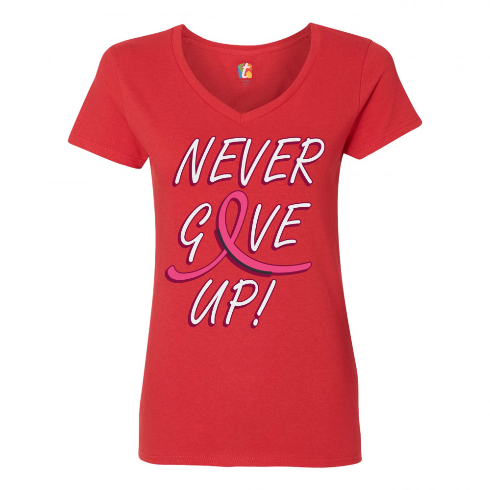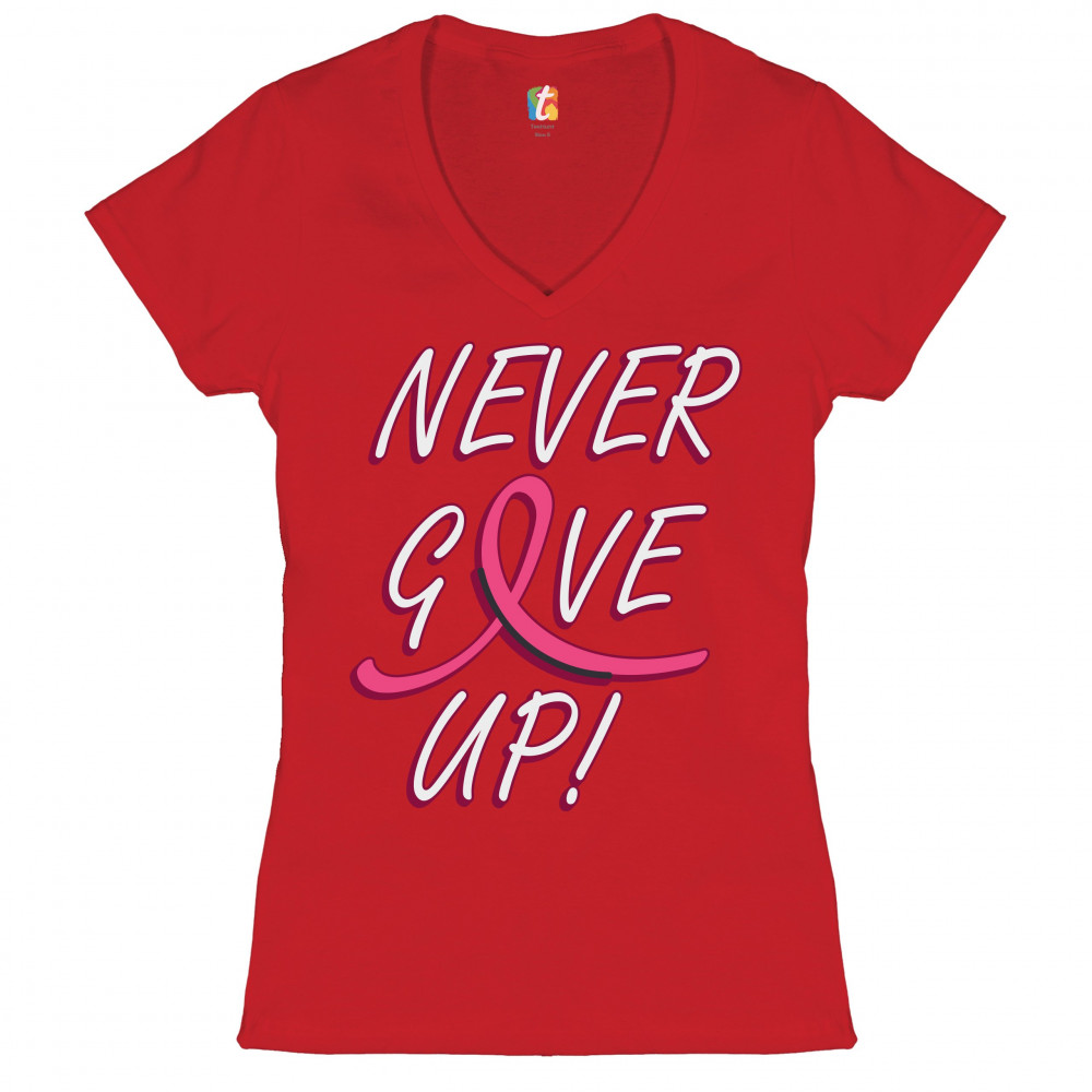 BREAST CANCER AWARENESS NEVER GIVE UP women's v-neck t-shirt pink ribbon tee red