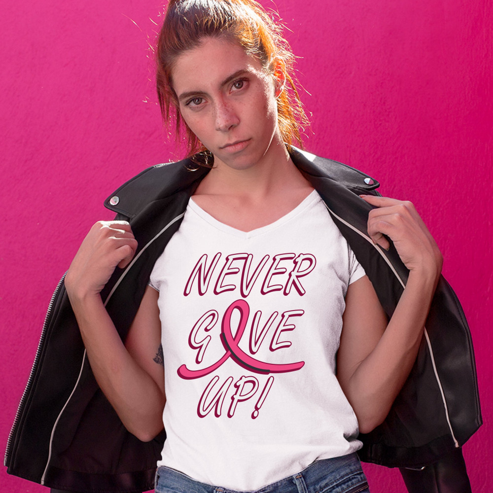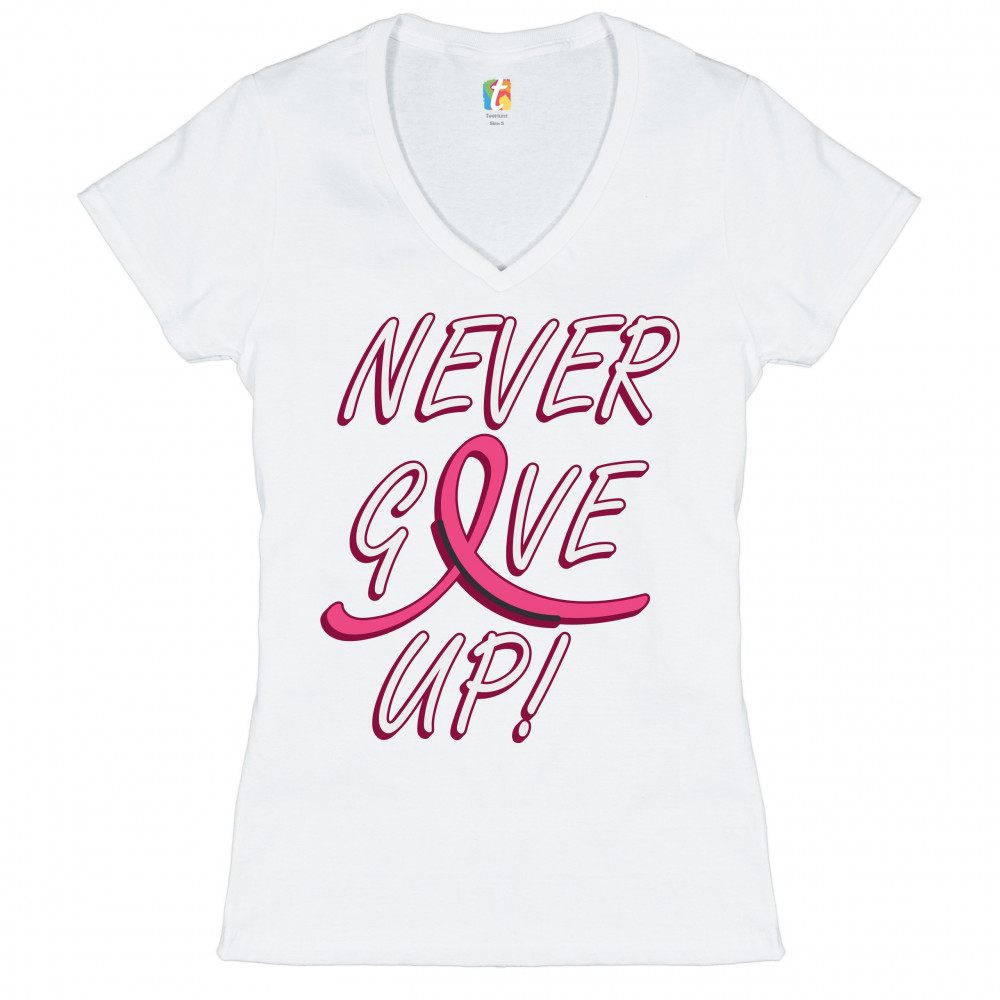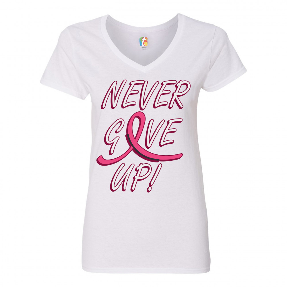 BREAST CANCER AWARENESS NEVER GIVE UP women's v-neck t-shirt pink ribbon tee white
