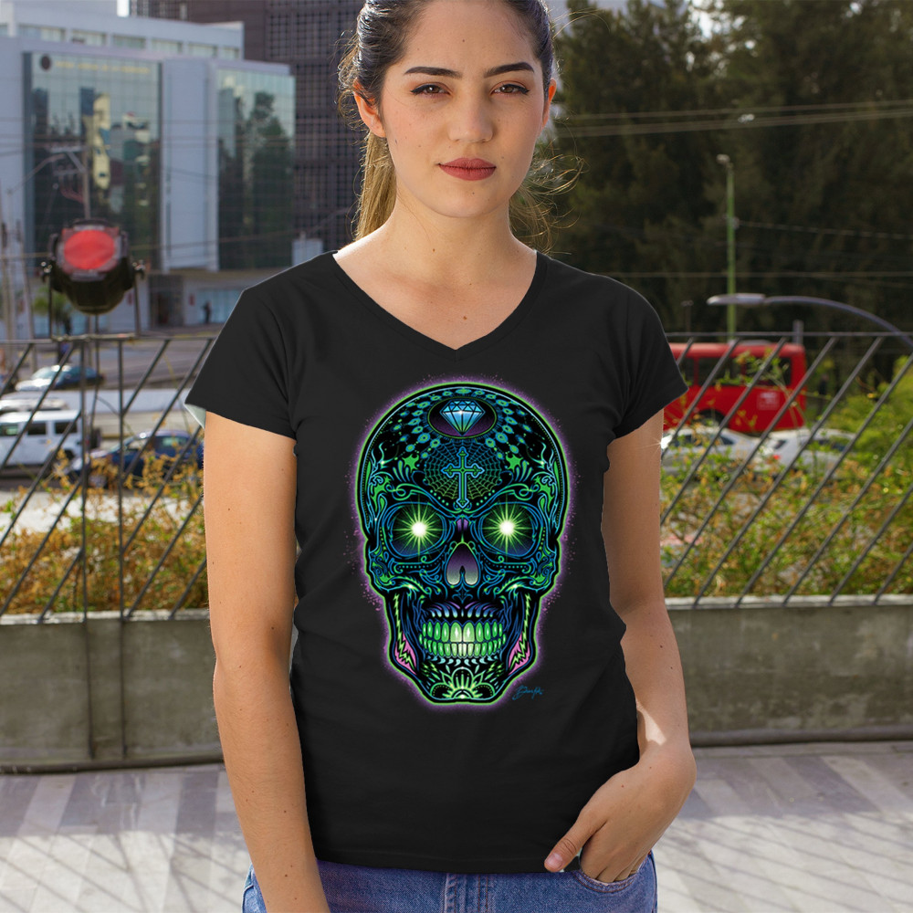 BRIGHT SUGAR SKULL women's v-neck t-shirt colorful neon day of the dead tee black