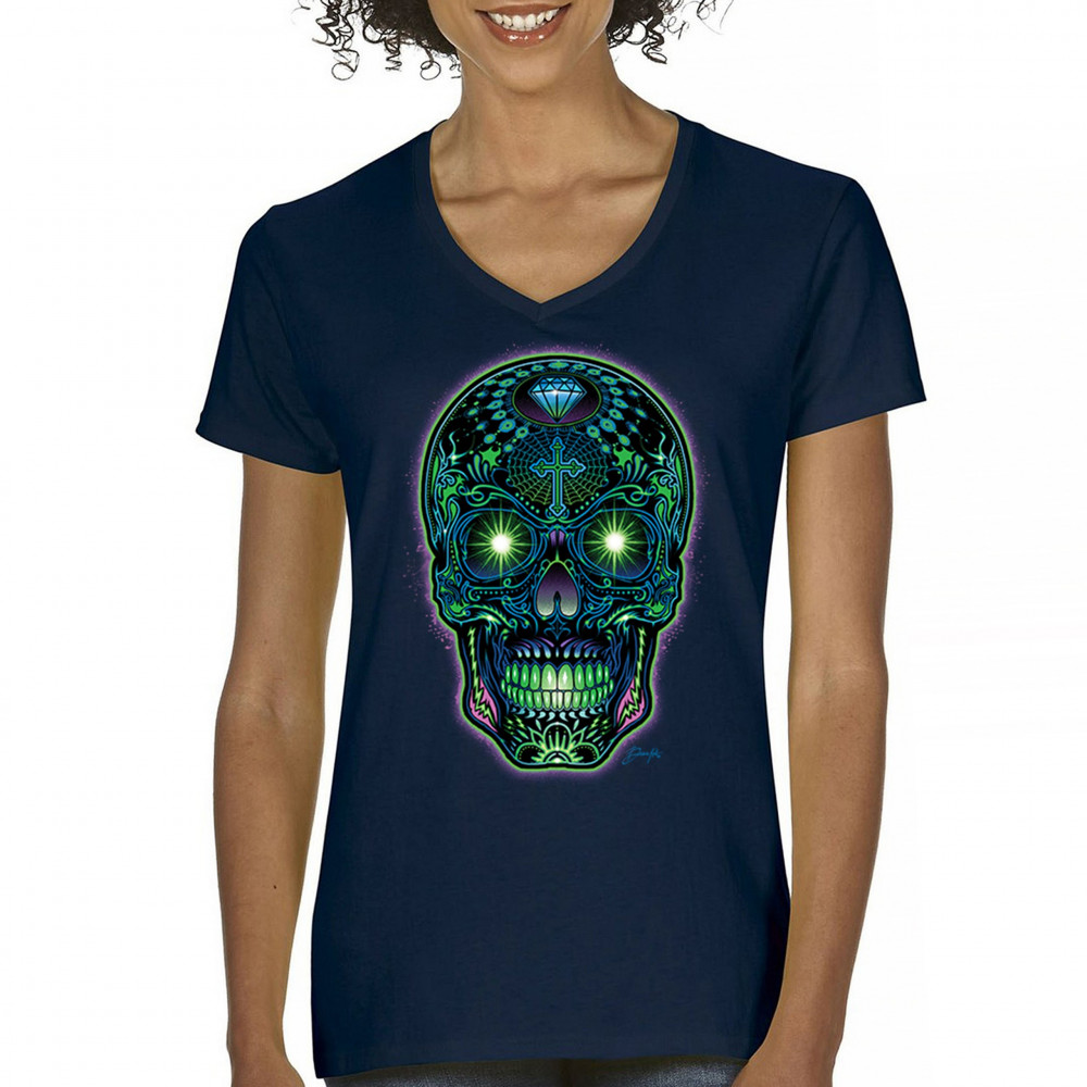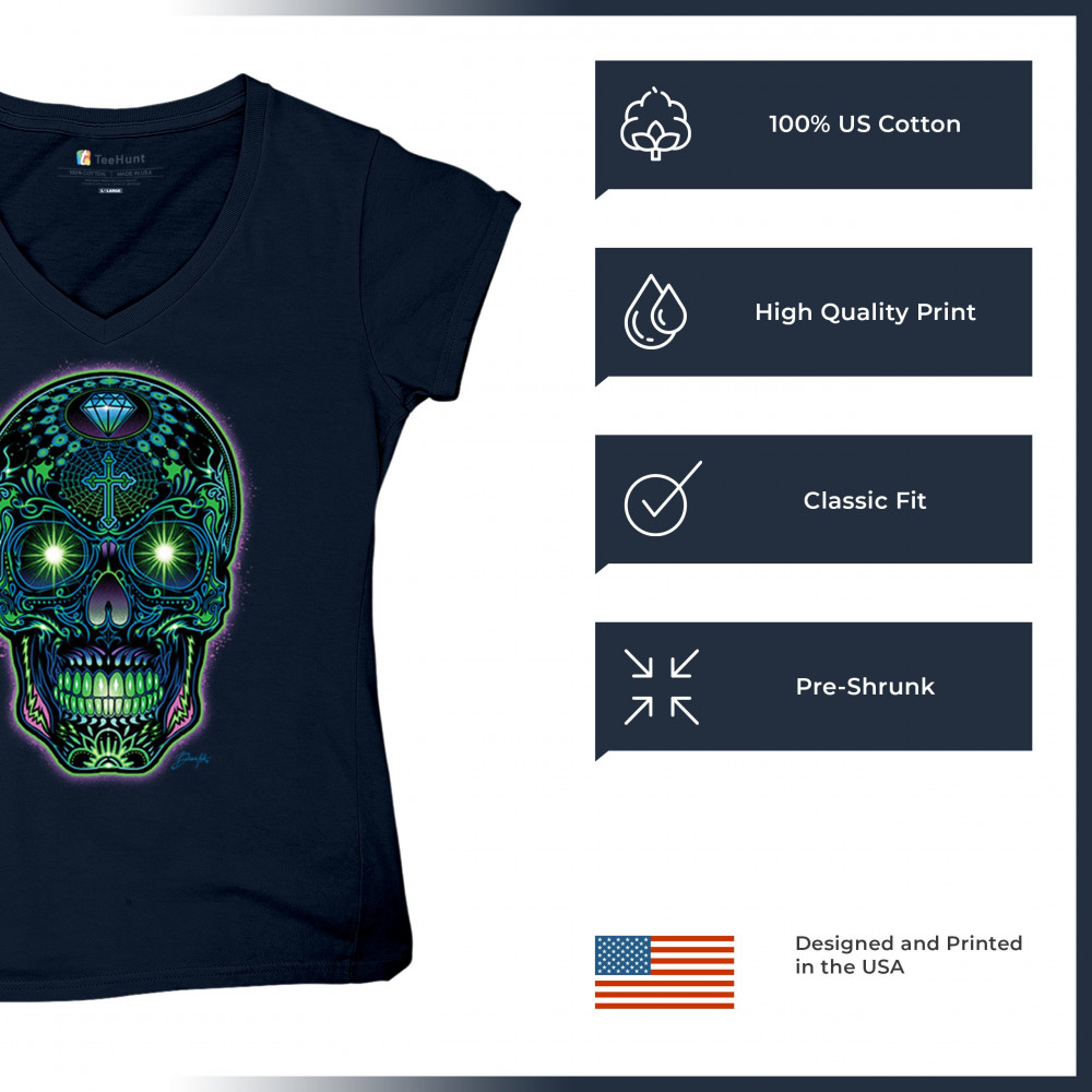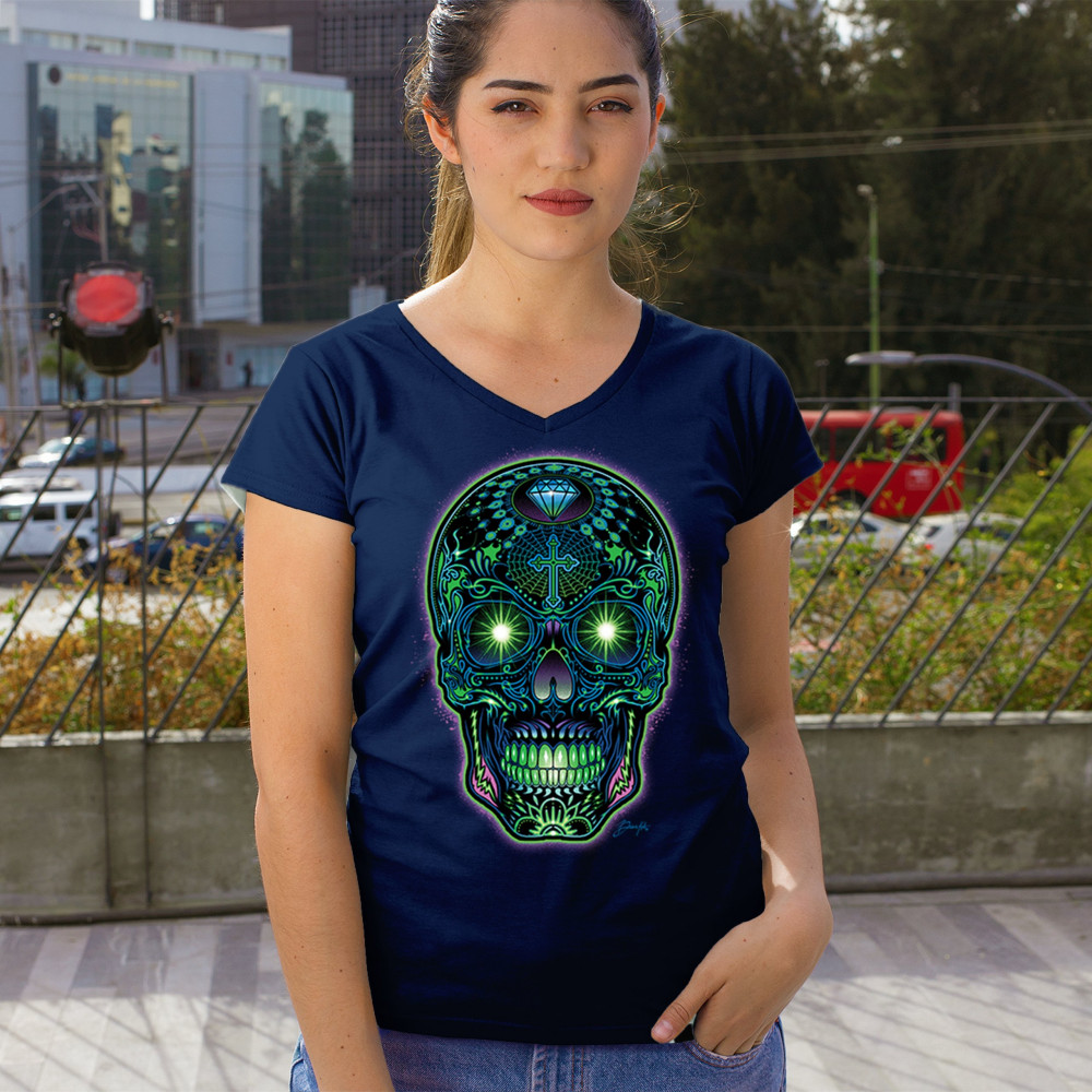 Electrified sugar skull with glowing green eyes, neon cross and diamond, perfect for rave lovers, skull art fans, and Day of the Dead style.