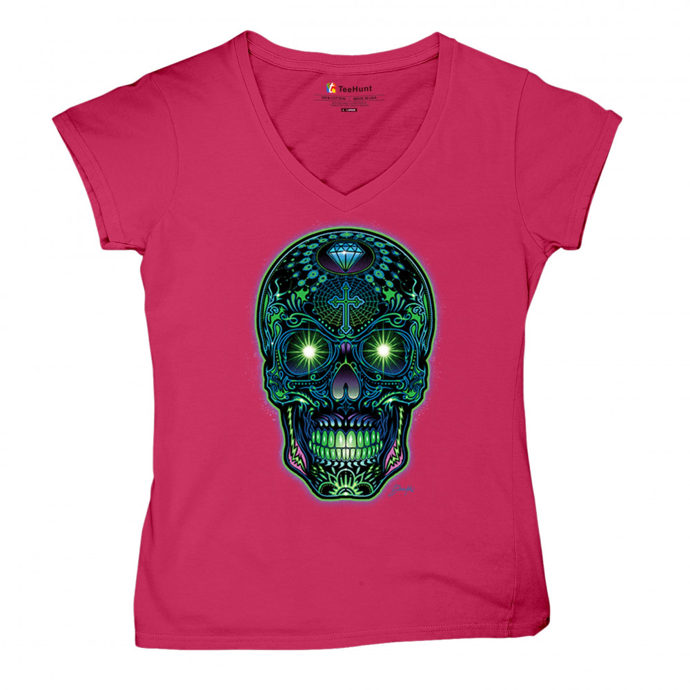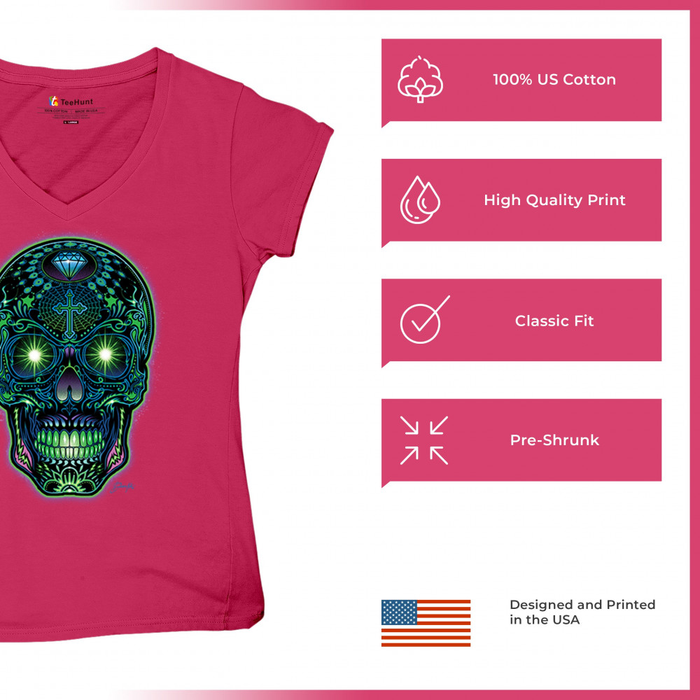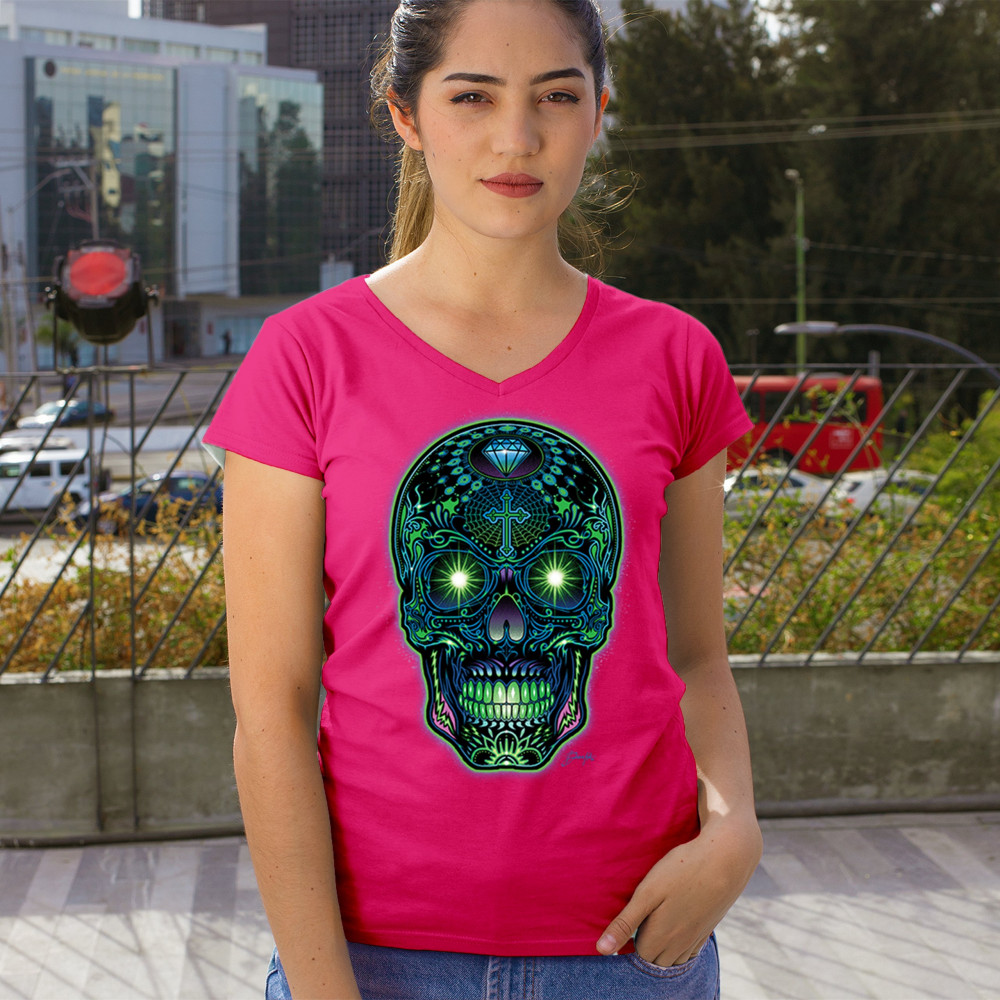 Electrified sugar skull with glowing green eyes, neon cross and diamond, perfect for rave lovers, skull art fans, and Day of the Dead style.