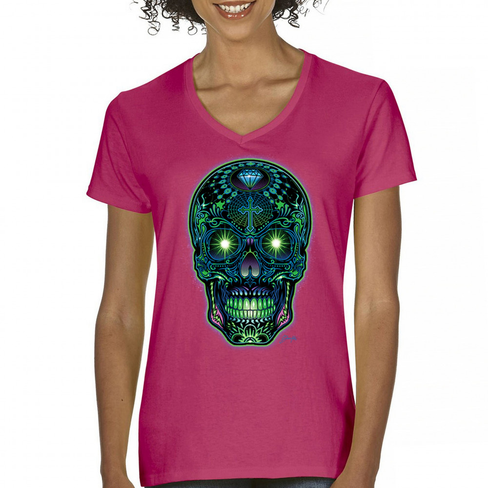 This electrified sugar skull design glows with neon energy and intricate details. Featuring green eyes, radiant cross, diamond, spider web, and vivid colors, it's a bold mash-up of psychedelic art, Day of the Dead tradition, and rave culture. A vibrant design perfect for skull fans and spiritual rebels alike.