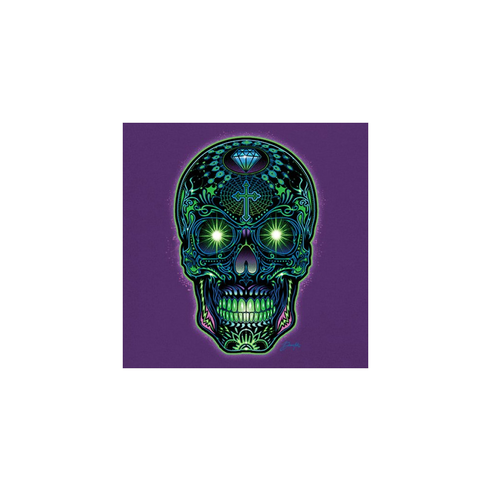 This electrified sugar skull design glows with neon energy and intricate details. Featuring green eyes, radiant cross, diamond, spider web, and vivid colors, it's a bold mash-up of psychedelic art, Day of the Dead tradition, and rave culture. A vibrant design perfect for skull fans and spiritual rebels alike.